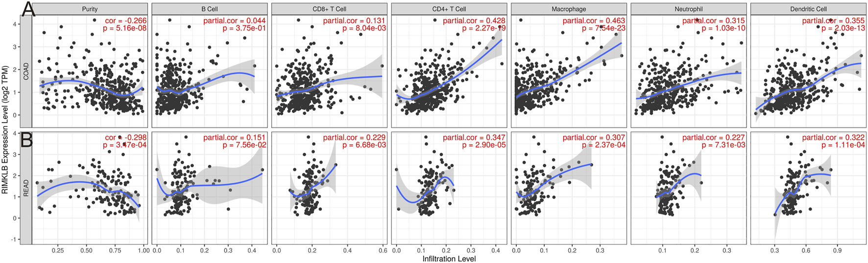 Correlation of RIMKLB expression with immune infiltration level in COAD (colon adenocarcinoma), and READ (recutm adenocarcinoma) in the TIMER database. (A) RIMKLB expression is significantly negatively related to tumor purity and has significant positive correlations with infiltrating levels of CD8+ T cells, CD4+ T cells, macrophages, neutrophils, and dendritic cells in COAD, other than B cells. (B) RIMKLB expression is significantly negatively related to tumor purity and has significant positive correlations with infiltrating levels of B cells, CD8+ T cells, CD4+ T cells, macrophages, neutrophils, and dendritic cells in READ.