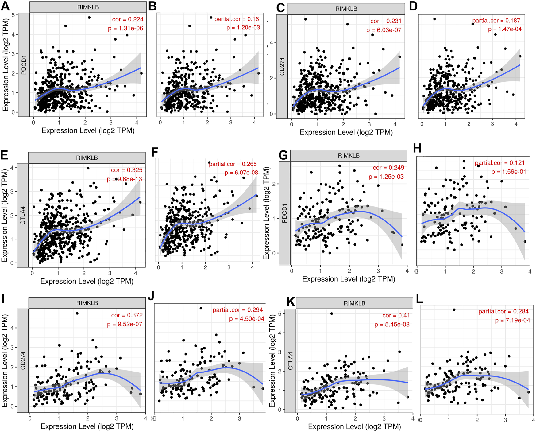Correlation of RIMKLB expression with PD1, PDL1, and CTLA4 in COAD, and READ. RIMKLB expression has significant positive correlations with infiltrating levels of PD1 (A,B), PDL1 (C,D) and CTLA4 (E,F) before and after purity adjustment in COAD; As well as in READ [PD1 (G,H), PDL1 (I,J) and CTLA4 (K,L)].