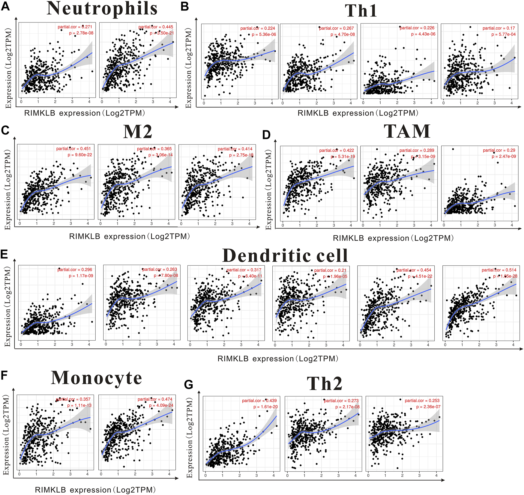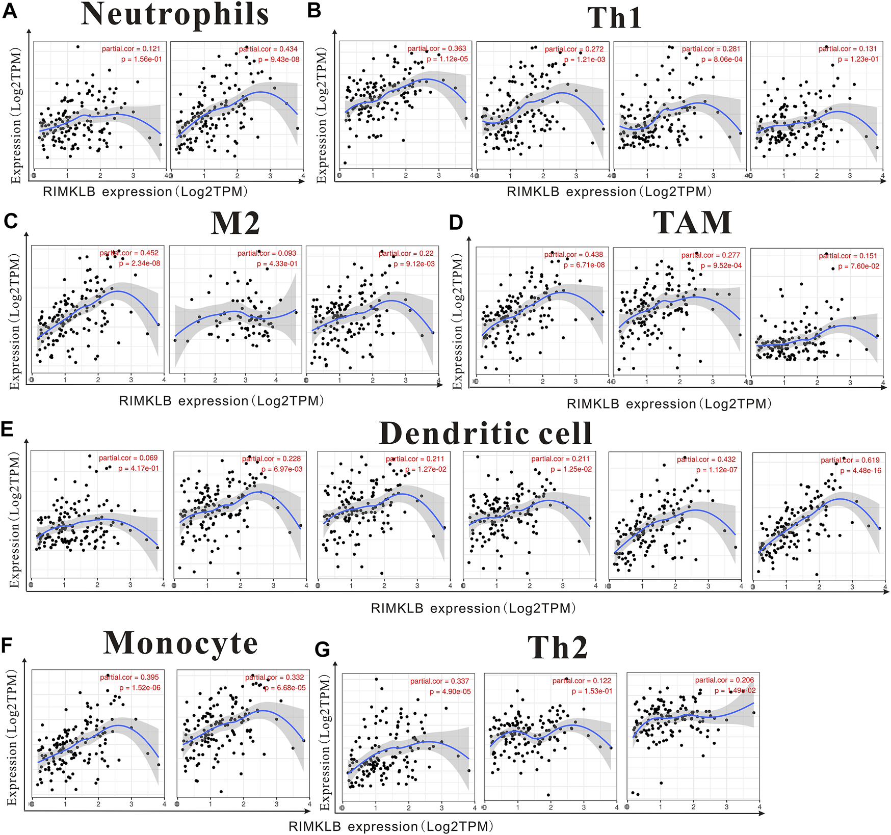 Additionally, the correlation between RIMKLB expression and gene markers of TIICs, including CD8+ T cells, T cells (general), B cells, monocytes, tumor-associated macrophages (TAMs), M1 macrophages, M2 macrophages, neutrophils, natural killer (NK) cells, DCs, T-helper 1 (Th1) cells, T-helper 2 (Th2) cells, follicular helper T (Tfh) cells, T-helper 17 (Th17) cells, Tregs, and exhausted T cells, was explored through related modules, which were reported in a previous study (Wu et al., 2020).