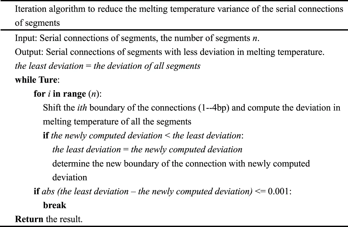 The greedy algorithm divides the input sequence into serial connections of segments with an approximately equal melting temperature. In theory, the algorithm cannot guarantee the best result. In an attempt to reduce the melting temperature variance of these serial connections of segments, iteration algorithm is carried out (Table 2).