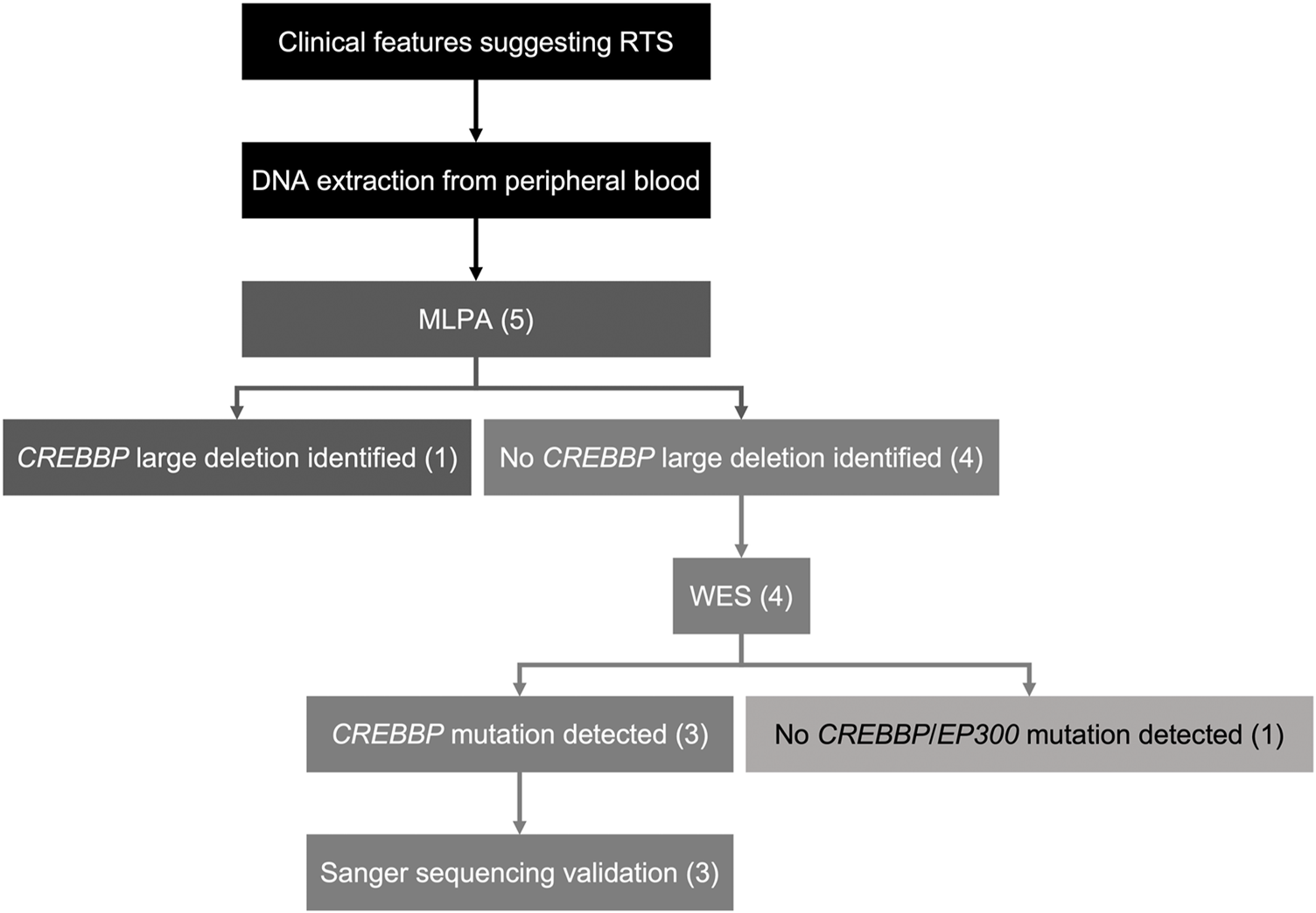 Schematic of the diagnostic workflow in this study. Five patients clinically diagnosed with RSTS were enrolled. MLPA was done on DNA samples of all the RSTS patients. 1/5 patient (20%) was found to harbor a large de novo deletion spanning CREBBP. WES was performed on DNA samples of the other four patients showing negative MLPA results. 3/5 patients (60%) were found to have novel CREBBP mutations with high pathogenicity scores. 1/5 patient (20%) showed negative results for MLPA and WES.