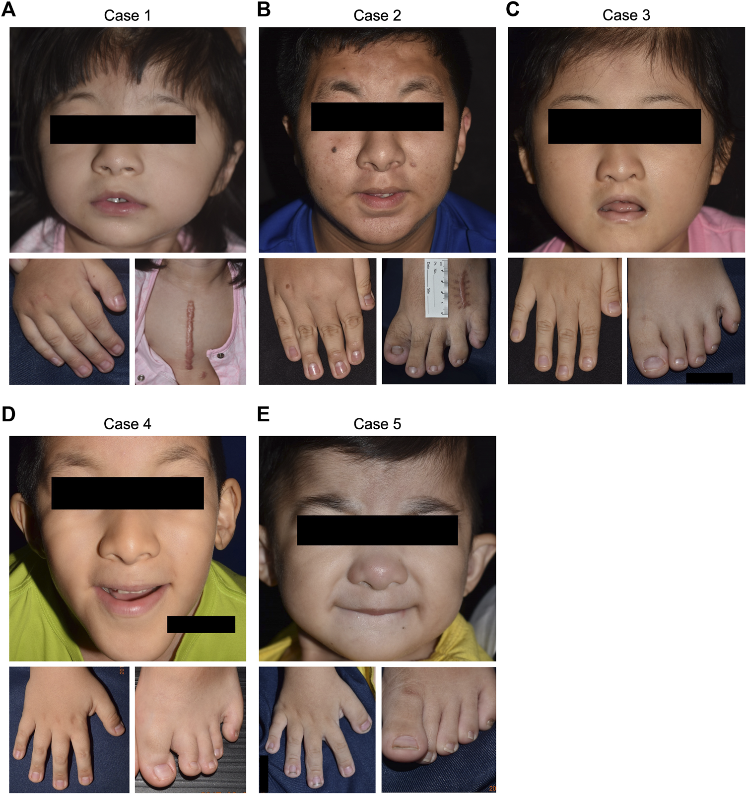 Clinical manifestations of the five RSTS cases. Positive findings of common RSTS characteristics, including distinctive facial features, and broadened thumbs and halluces, were noted in all of the enrolled cases. (A) case 1. (B) case 2. (C) case 3. (D) case 4. (E) case 5.