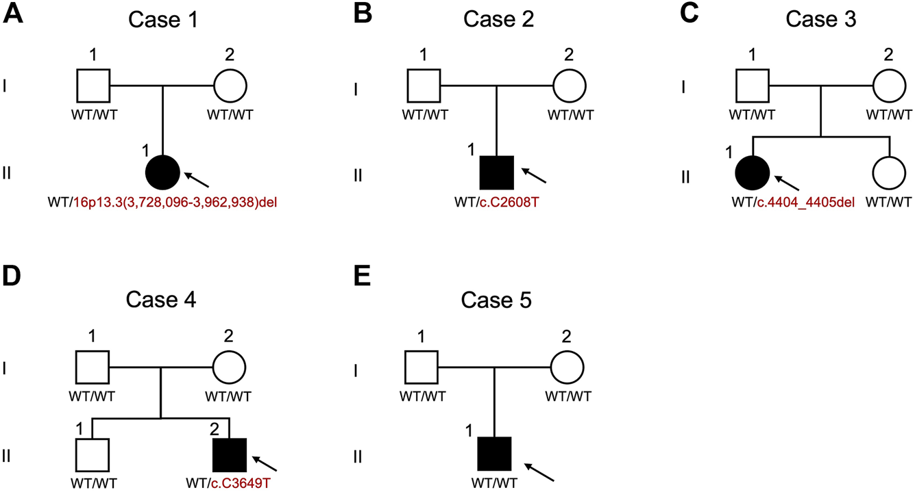 Pedigrees and schematic summary of genetic alteration discoveries in this study. (A) case 1. (B) case 2. (C) case 3. (D) case 4. (E) case 5. WT, wild type.
