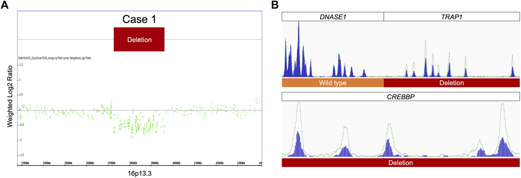 MLPA and WES results for case 1. (A) MLPA of the proband showing heterozygous deletion at 16p13.3. (B) A visualization of the WES results for case 1 show fewer reads in the proband than in the healthy control, confirming the heterozygous deletion detected by MLPA.