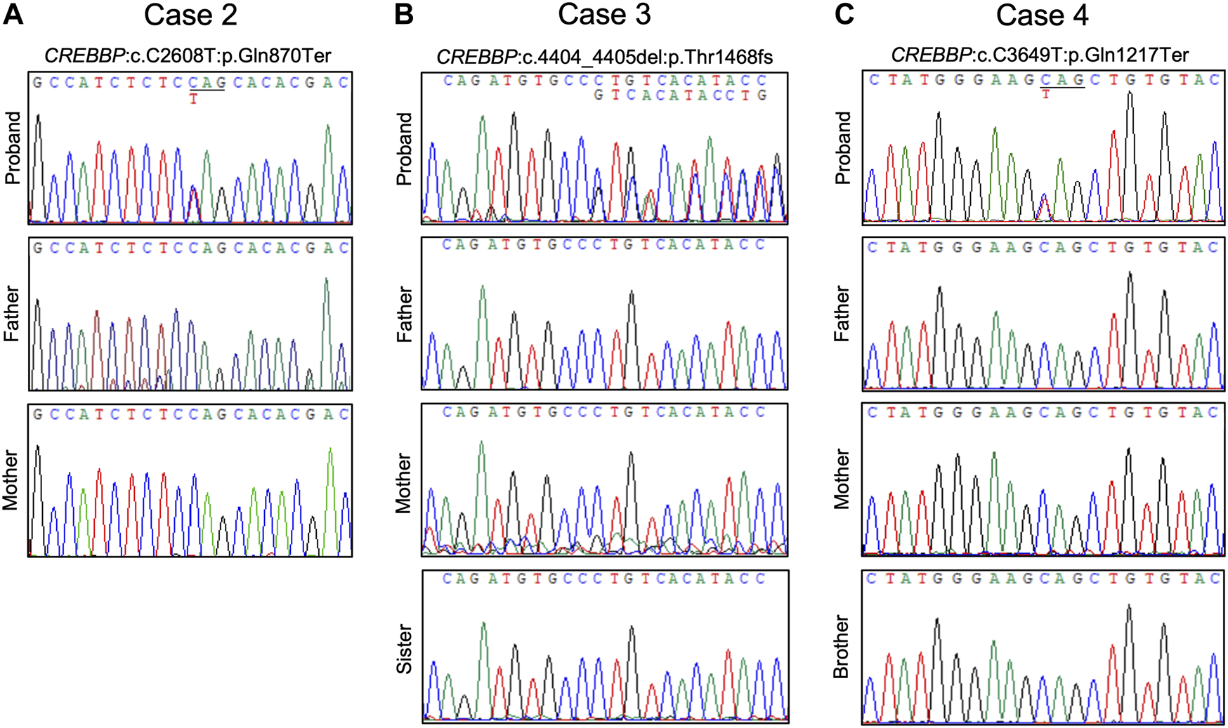 Chromatograms of confirmative PCR-based Sanger sequencing and segregation analysis results. (A) A de novo nonsense CREBBP mutation in case 2. (B) A de novo CREBBP 2-bp deletion in case 3. (C) The CREBBP nonsense mutation was detected in both case 4 and the proband’s mother.