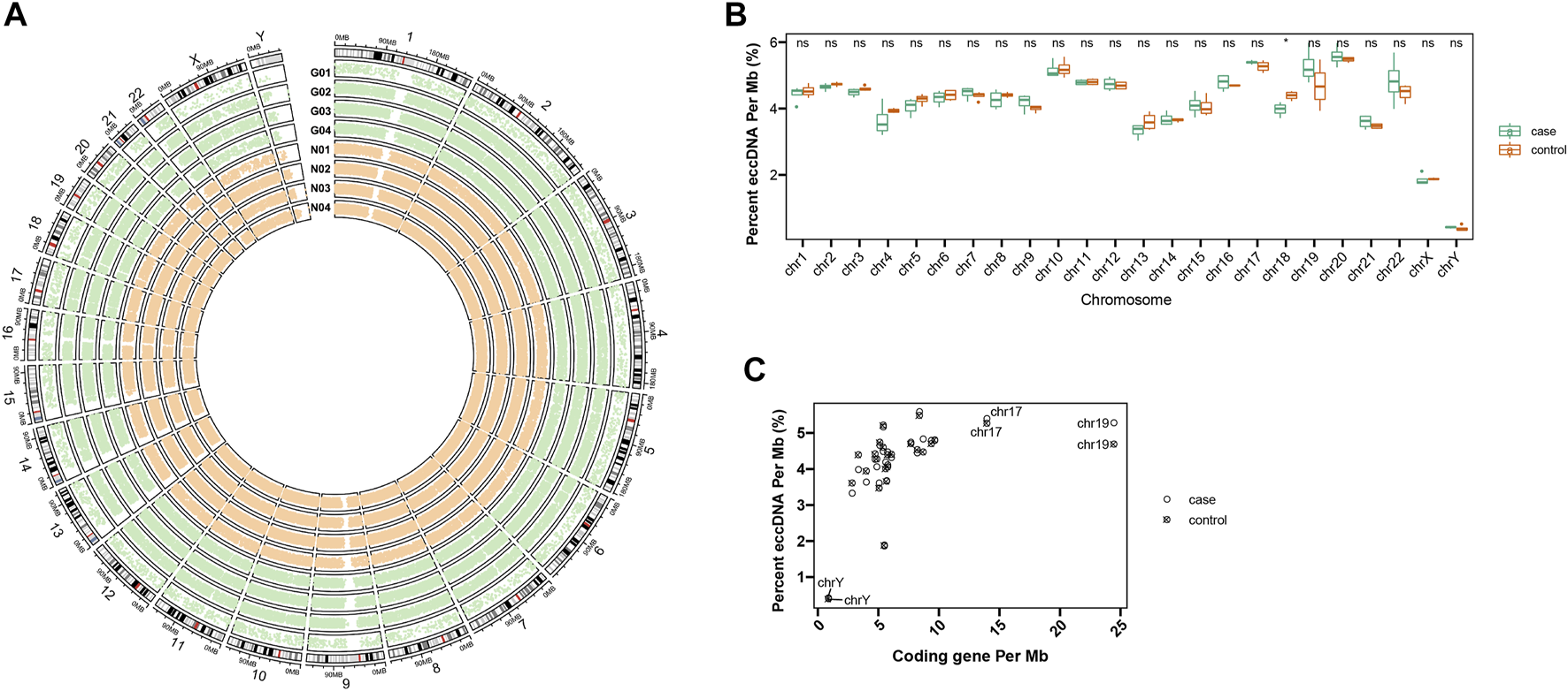 Distribution of plasma eccDNAs across human chromosomes. (A) The circos plot of eccDNA distributions from four acute gout patients (G01-G04) and four healthy controls (N01-N04). (B) The eccDNA distributions of gout and control on each chromosome. Ns stands for there are no significant differences of eccDNA distribution between control and gout group. * shows there are significant differences of eccDNA distribution between control and gout group on chromosome 18. (C) The frequency of eccDNAs per Mb and coding genes per Mb on each chromosome.