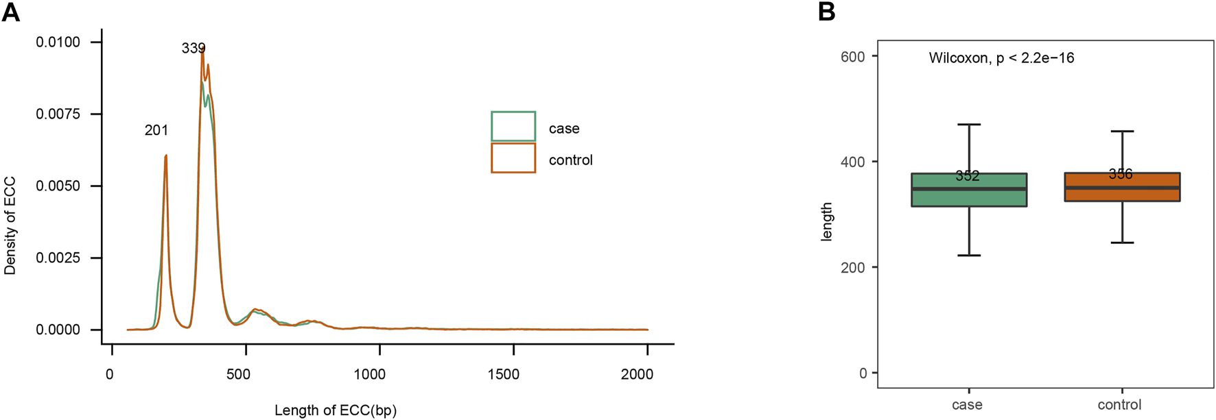 Size distribution of eccDNAs from these eight plasma samples showed comparable size distributions between the gout and healthy control group (Figure 2A). The plasma eccDNAs displayed two distinctive peaks at 201 bp and 339 bp, and the 339 bp peak was more predominant than the 201 bp peak (Figure 2A). This size signature was in concordance with previous observations studying plasma eccDNA (Kumar et al., 2017; Sin et al., 2020). When comparing the eccDNA size <2 kb between the gout and control group, we detected significantly longer eccDNA sequences in the healthy control by Wilcoxon rank sum test (p-value < 2.2e -16; Figure 2B).