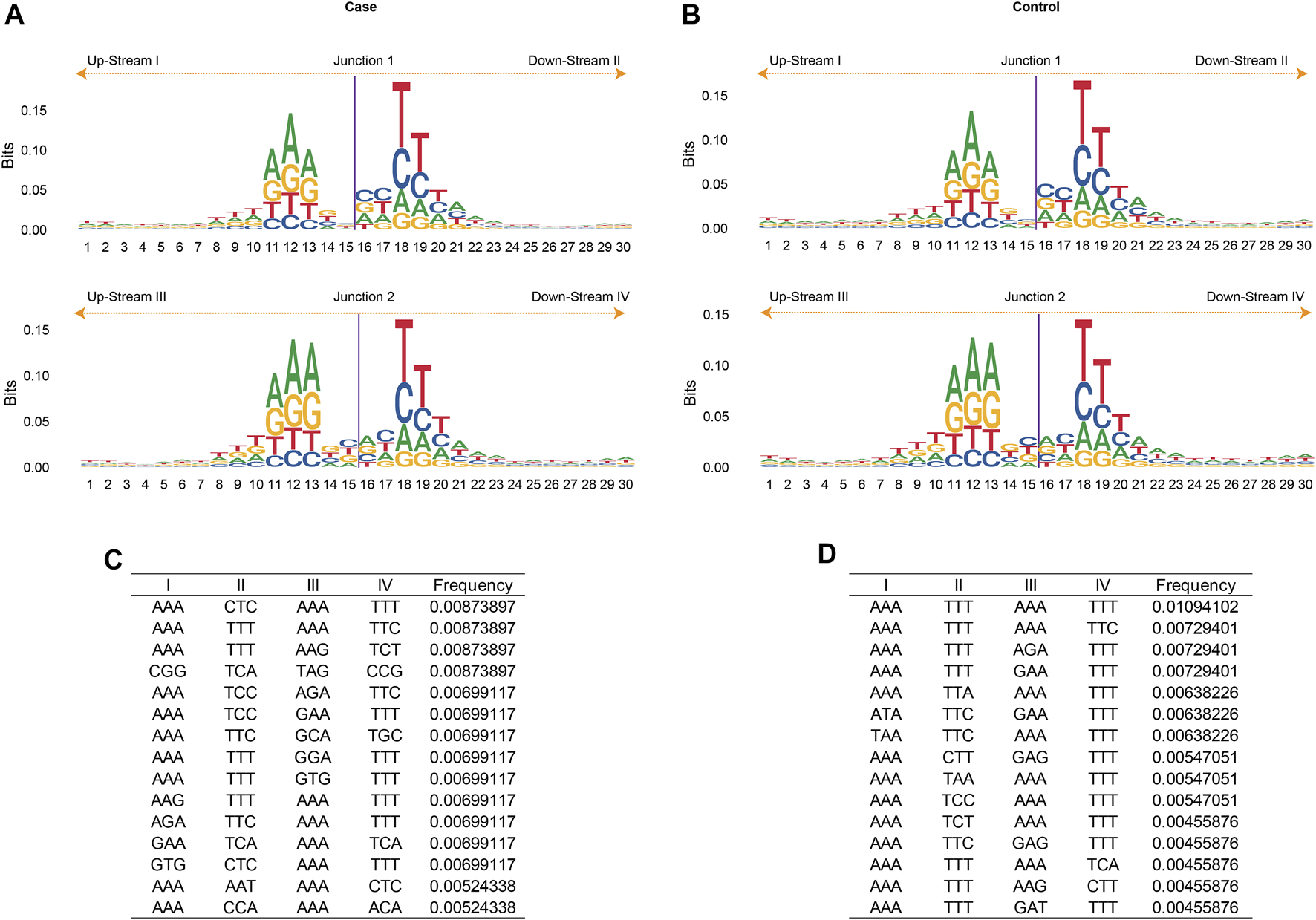 The motif analysis of eccDNA junctions. The nucleotide composition from 15 bp upstream to 15 bp downstream of the start (Junction 1) and end position (Junction 2) of the eccDNA junction in acute gout (A) and healthy control (B). The frequency of base distribution at each position is plotted as a stacked histogram. The size of four bases at each position in the figure reflects their frequency. The 3-bp motifs flanking the start and end site in acute gout (C) and healthy control (D). Data were ranked by motif frequencies. I, II, III, IV refers to 3-bp upstream of start site, 3-bp downstream of start site, 3-bp upstream of end site, and 3-bp downstream of end site, respectively.