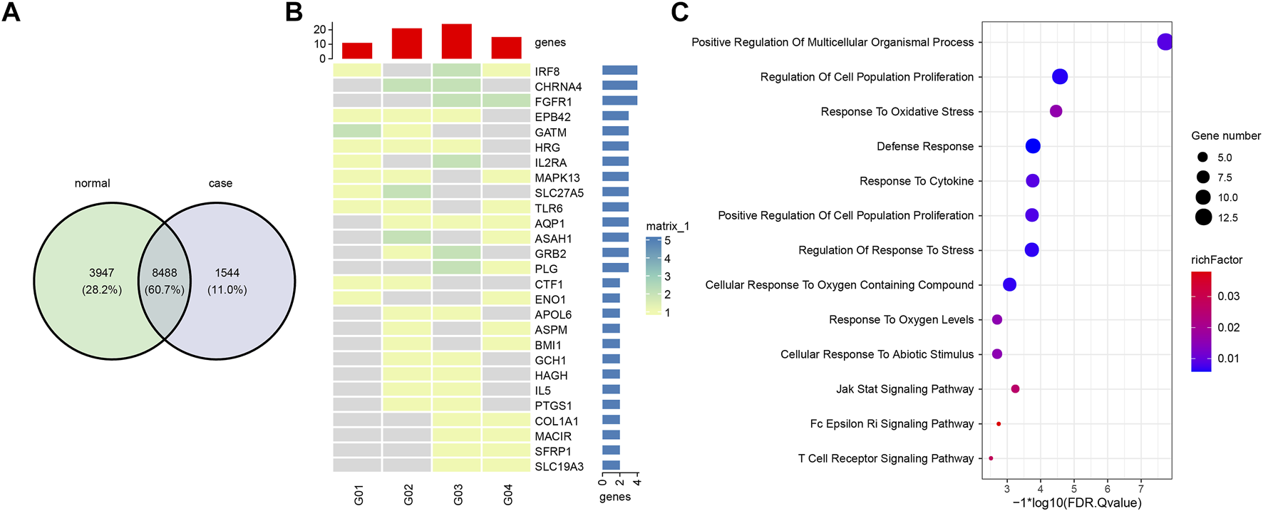 Comparison and functional analysis of eccDNA genes. (A) Shared and unique eccDNA genes between gout and healthy controls. (B) A heatmap of 27 gout unique eccDNA genes involved in inflammatory response or potentially gout-related diseases. (C) Functional enrichment of 27 gout unique eccDNA genes.