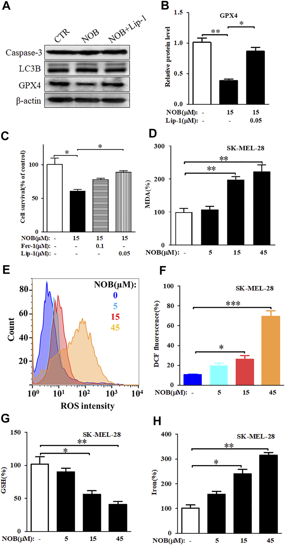 Nobiletin induces ferroptosis in melanoma cells. (A) Western blot analysis of Caspase 3, LC3B, and GPX4 expression levels in SK-MEL-28 cells cultured with nobiletin (15 μM) or nobiletin in combination with Lip-1. (B) The protein levels of GPX4 in SK-MEL-28 cells treated with nobiletin (15 μM) or nobiletin in combination with Lip-1. (C) Cell viability of SK-MEL-28 cells treated with nobiletin (15 μM), nobiletin in combination with Fer-1 or Lip-1. (D–H) The levels of MDA, ROS, GSH, and iron in SK-MEL-28 cells treated with indicate concentration of nobiletin (5, 15, 45 μM). n = 3, *p < 0.05, **p < 0.01, and ***p < 0.001.