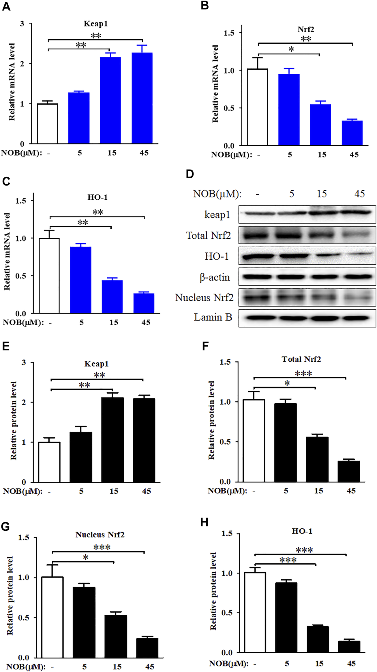 Nobiletin inhibits Keap1/Nrf2/HO-1 axis in melanoma cells. (A–C) The mRNA levels of Keap1, Nrf2, and HO-1 in SK-MEL-28 cells treated with indicate concentration of nobiletin (5, 15, and 45 μM). (D,H) The protein levels of Keap1, total Nrf2, nucleus Nrf2, and HO-1 in SK-MEL-28 cells treated with nobiletin (5, 15, and 45 μM). n = 3, *p < 0.05, **p < 0.01, and ***p < 0.001.