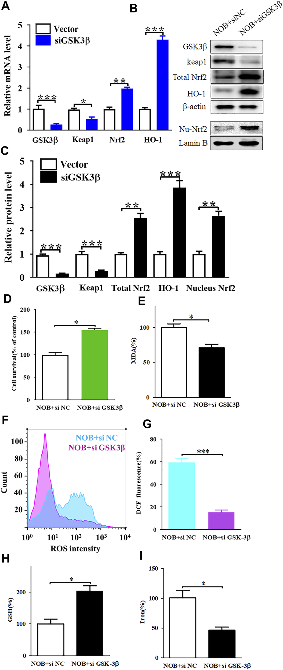 Gene knockdown of GSK3β upregulates of Keap1/Nrf2/HO-1 signaling pathway and significantly reduces nobiletin-induced ferroptosis. (A) The mRNA levels of Keap1, Nrf2, and HO-1 in SK-MEL-28 cells with reduced expression of GSK3β. (B,C) The protein levels of Keap1, total Nrf2, nucleus Nrf2, and HO-1 in SK-MEL-28 cells with reduced expression of GSK3β. (D) Cell viability of SK-MEL-28 cells with reduced expression of GSK3β after nobiletin-treatment. (E–I) The levels of MDA, ROS, GSH, and iron in SK-MEL-28 cells with reduced expression of GSK3β after nobiletin-treatment. n = 3, *p < 0.05, **p < 0.01, and ***p < 0.001.
