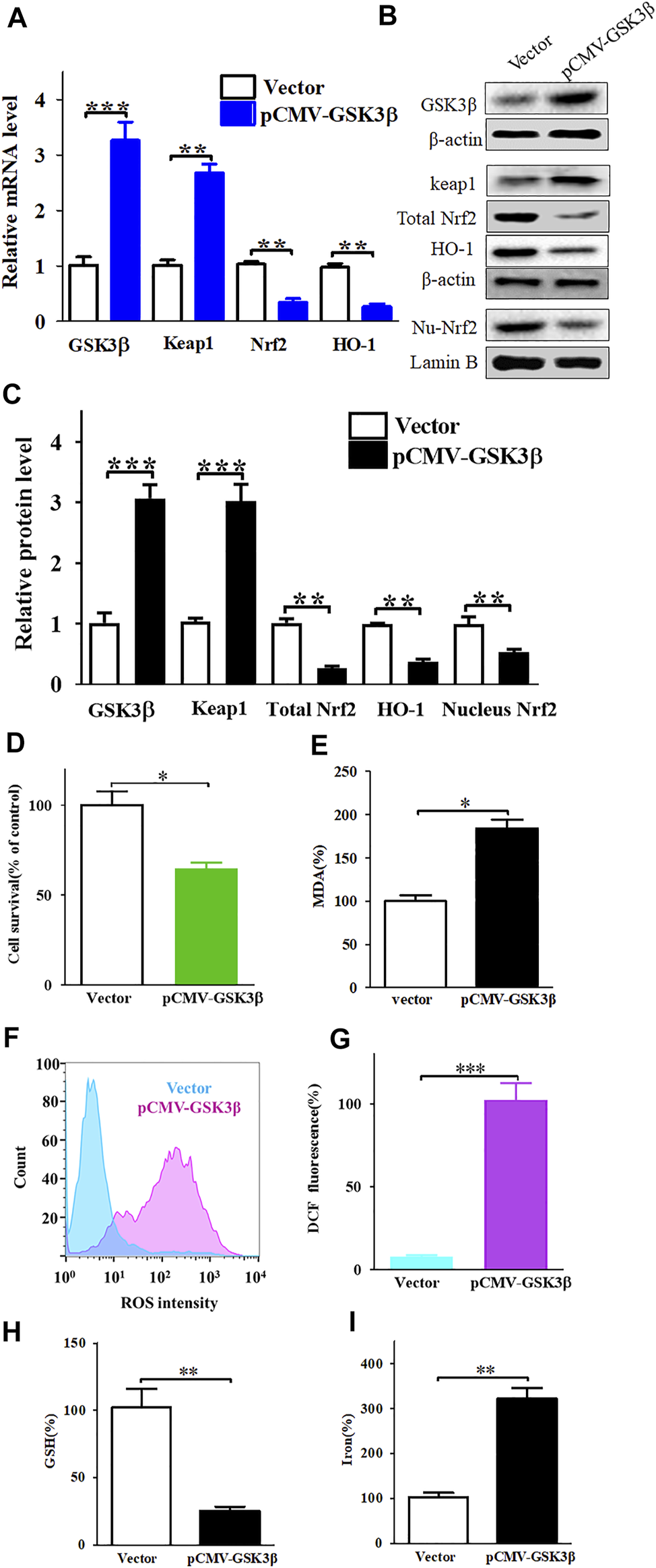 Enhanced expression of GSK3β downregulates of Keap1/Nrf2/HO-1 signaling pathway and significantly increases nobiletin-induced ferroptosis. (A) The mRNA levels of Keap1, Nrf2, and HO-1 in SK-MEL-28 cells with enhanced expression of GSK3β. (B,C) The protein levels of Keap1, total Nrf2, nucleus Nrf2 and HO-1 in SK-MEL-28 cells with enhanced expression of GSK3β. (D) Cell viability of SK-MEL-28 cells with enhanced expression of GSK3β after nobiletin-treatment. (E–I) The levels of MDA, ROS, GSH, and iron in SK-MEL-28 cells with enhanced expression of GSK3β after nobiletin-treatment. n = 3, *p < 0.05, **p < 0.01, and ***p < 0.001.