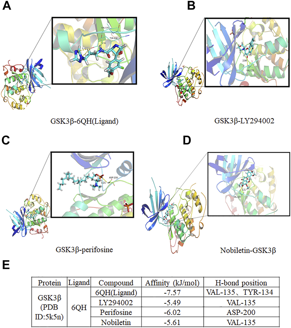 Molecular docking analysis of nobiletin with GSK3β. (A–D) The complex structure of GSK3β with 6QH(Ligand), LY294002, Perifosine, and nobiletin. (E) Docking scores of the complexes.