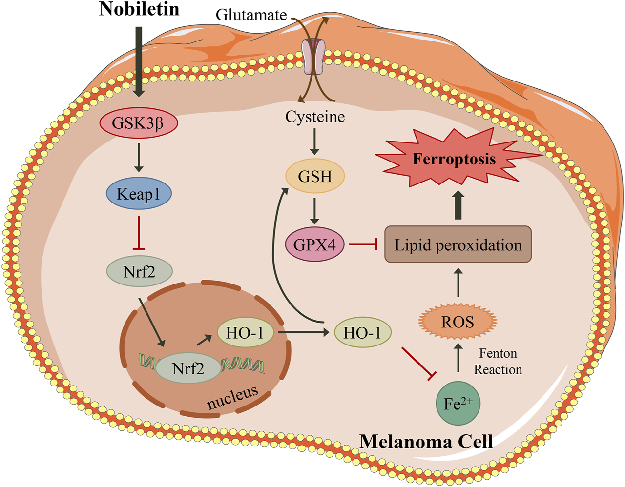 A proposed model illustrating that nobiletin induces ferroptosis in melanoma cells. Nobiletin increases the expression of GSK3β, which activates Keap1 and inhibits the Nrf2/HO-1 axis. Nobiletin leads to the accumulation of iron and ROS. In another side, inhibiton of Keap1/Nrf2/HO-1 axis suppresses GSH, and then inactivates GPX4. Both ROS accumulation and GPX4 inactivation give rise to lipid peroxidation, thereby inducing ferroptosis. In summary, nobiletin induces ferroptosis by regulation of the GSK3β-mediated Keap1/Nrf2/HO-1 signaling pathway in human melanoma cells.