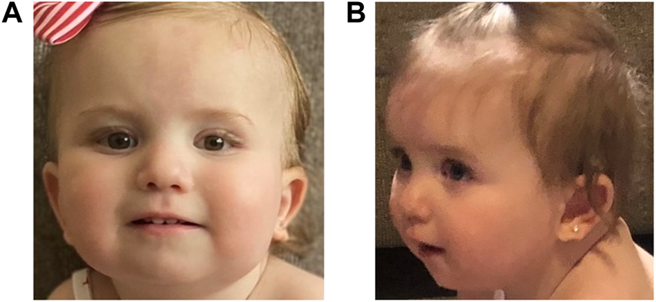 The patient established care with multiple subspecialty providers. At 2 months old, she was evaluated by a neurologist for concerns of abnormal hand movements. An EEG at 4 months of age was normal. Hypotonia was noted at 4 months, and an early intervention evaluation was recommended; she obtained speech and physical therapy. Ophthalmology evaluations showed an abnormal right optic nerve and left microphthalmos. At 5 months of age, she established care with dermatology for red pigmentation over her face, neck, buttocks, back, and genitalia, concerning for capillary malformations. At 7 months of age, she was referred to neurosurgery for a skin lesion in the sacral area, concerning for a spinal dysraphism. Workup, including a spinal MRI, showed evidence of a tethered cord. The patient underwent corrective surgery at 1 year old. At 14 months of age, the patient began to have feeding difficulties. A modified barium swallow showed aspiration. The patient started crawling at 16 months and was standing and cruising at 17 months old. She still exhibited speech delay at 17 months of age as she babbled but was not yet articulating words. She was able to feed herself and indicate her wants. The patient was also able to dress and undress with her parents’ assistance. At 21 months of age, she began to use a G-tube for feeding to prevent aspiration. Cardiac and audiology evaluations have been normal to date. Following her most recent early intervention evaluation, she qualified for feeding, speech, physical, occupational therapies, and special instruction (Figures 1A,B).