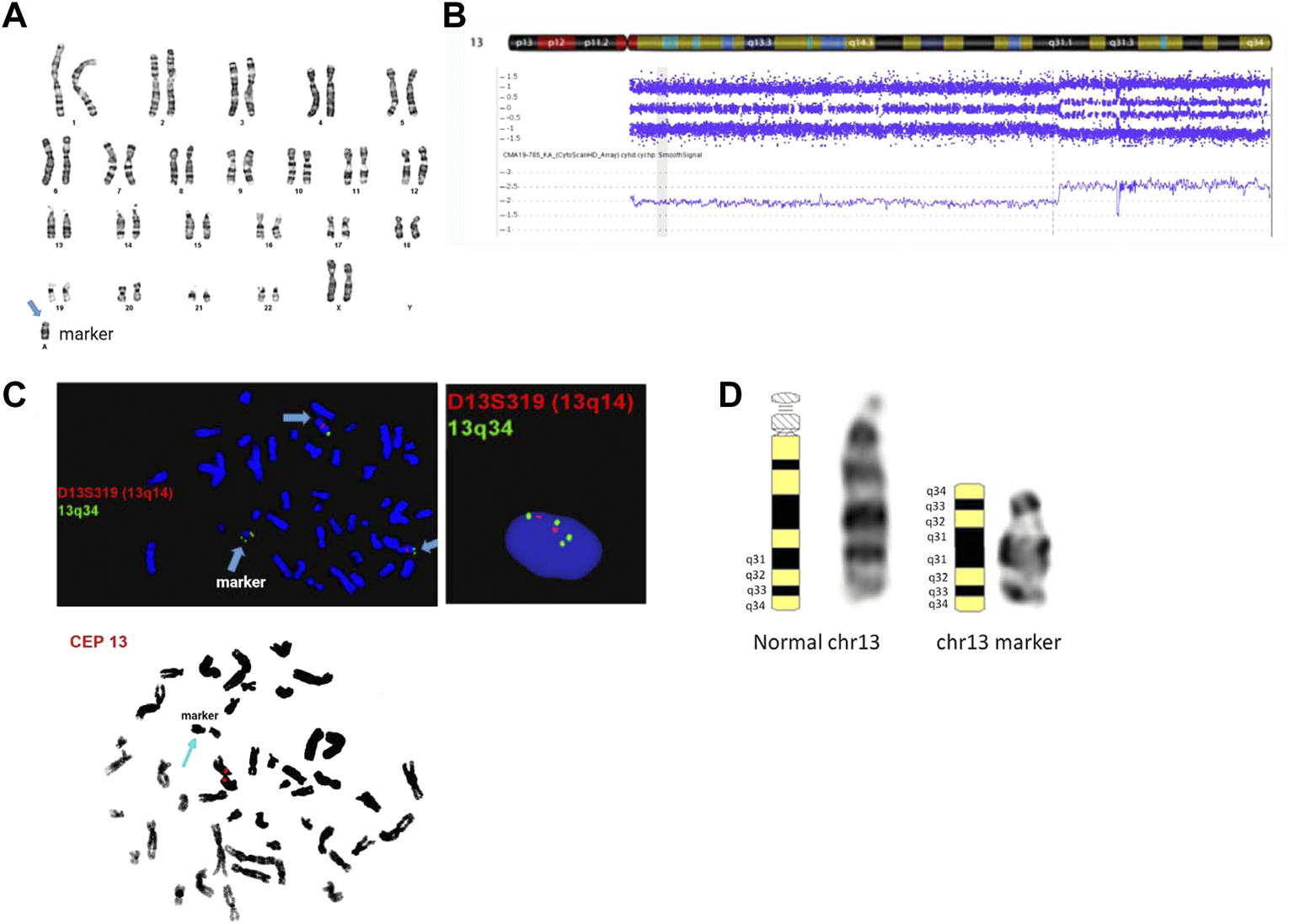 Cytogenetic and genomic characterization of the sSMC. Panel (A): female karyotype with a small supernumerary marker chromosome identified by G-banding from amniotic fluid; banding resolution: 400-band-level; panel (B): SNP-based microarray results showing 31.34 Mb gain in the distal end of chromosome 13q: arr [GRCh37] 13q31.1q34 (83,666,539_115,010,330)x2∼4; probe targets: 2,696,550; human genome build (hg19); panel (C): metaphase and interphase FISH results using probes mapping to 13q14 (D13S319), 13q34 (LAMP1), and chr 13 centromere. The final karyotype is: 47,XX,+mar[28]/46,XX[2]. nuc ish (D13S319x2,LAMP1x4)[122/300]. ish der (13) (D13S319,LAMP1++) (CEP13-); panel (D): chromosome 13 ideograms showing representative normal and marker chromosome 13 in the patient. The long form description of the marker chromosome cell line as per ISCN 2020 is as follows: 47,XX,+dup (13) (qter- > q31.1::q31.1- > q33- > neo- > q33- > qter).