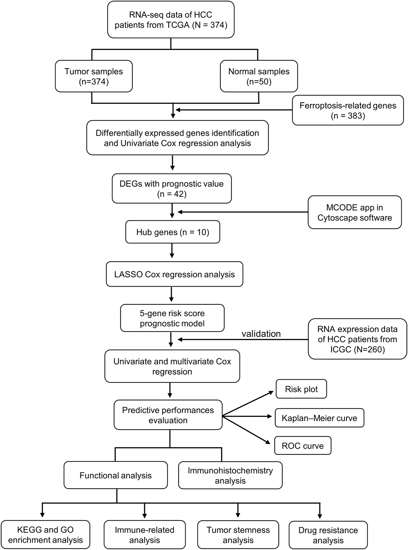 In this study, we obtained RNA expression data and clinical information from the TCGA and ICGC databases and analyzed them using bioinformatics tools. Thereafter, we constructed a protein–protein interaction (PPI) network to screen for hub genes. Next, we constructed a ferroptosis-related hub gene signature in the TCGA cohort, and the ICGC cohort was used to verify the reliability of the prognostic signature. In addition, functional enrichment analysis was conducted based on differentially expressed ferroptosis–related genes (FRGs) between the high-risk and low-risk groups. Finally, we further performed immune, tumor stemness, N6-methyladenosine (m6A) mRNA status, drug sensitivity, and immunohistochemical analysis. All of these might not only offer insight into the molecular mechanisms that participate in the tumorigenesis and progression of HCC but also provide an efficient method to predict the outcomes in HCC patients as well as contribute to selecting effective immunotherapy for HCC patients based on biomarkers.