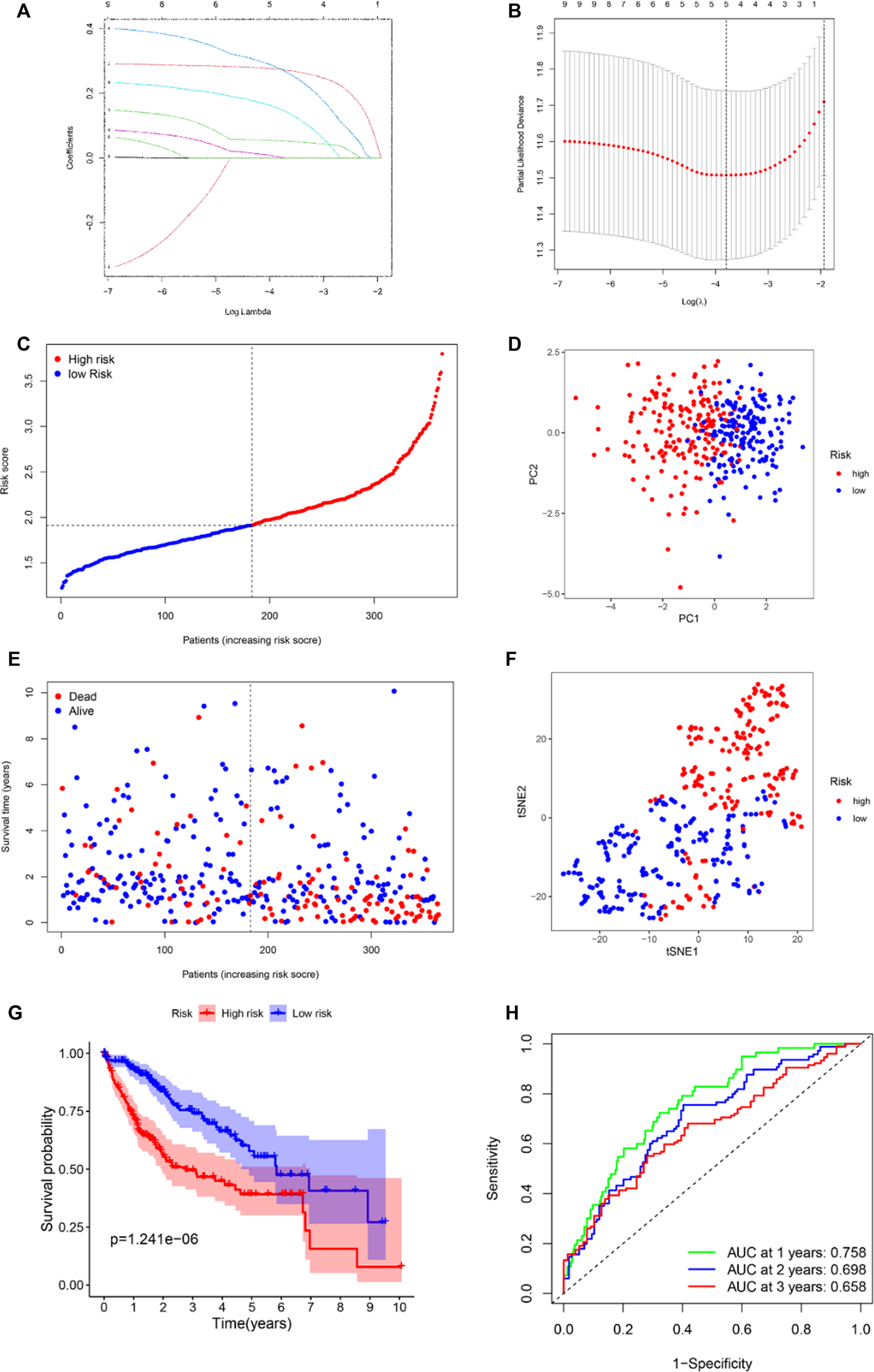 Establishment of ferroptosis-related hub gene signature in the TCGA set. (A) LASSO coefficient profiles of the expression of 41 candidate genes. (B) Selection of the penalty parameter (λ) in the LASSO model via 10-fold cross-validation. An optimal log λ value is indicated by the vertical black line in the plot. Risk score distribution (C), PCA plot (D), overall survival (OS) status (E), and t-SNE (F) analysis of TCGA cohort. (G) Kaplan–Meier curves for comparison of the OS between low- and high-risk groups. (H) Receiver operating characteristic (ROC) curves verified the prognostic performance of the risk score.