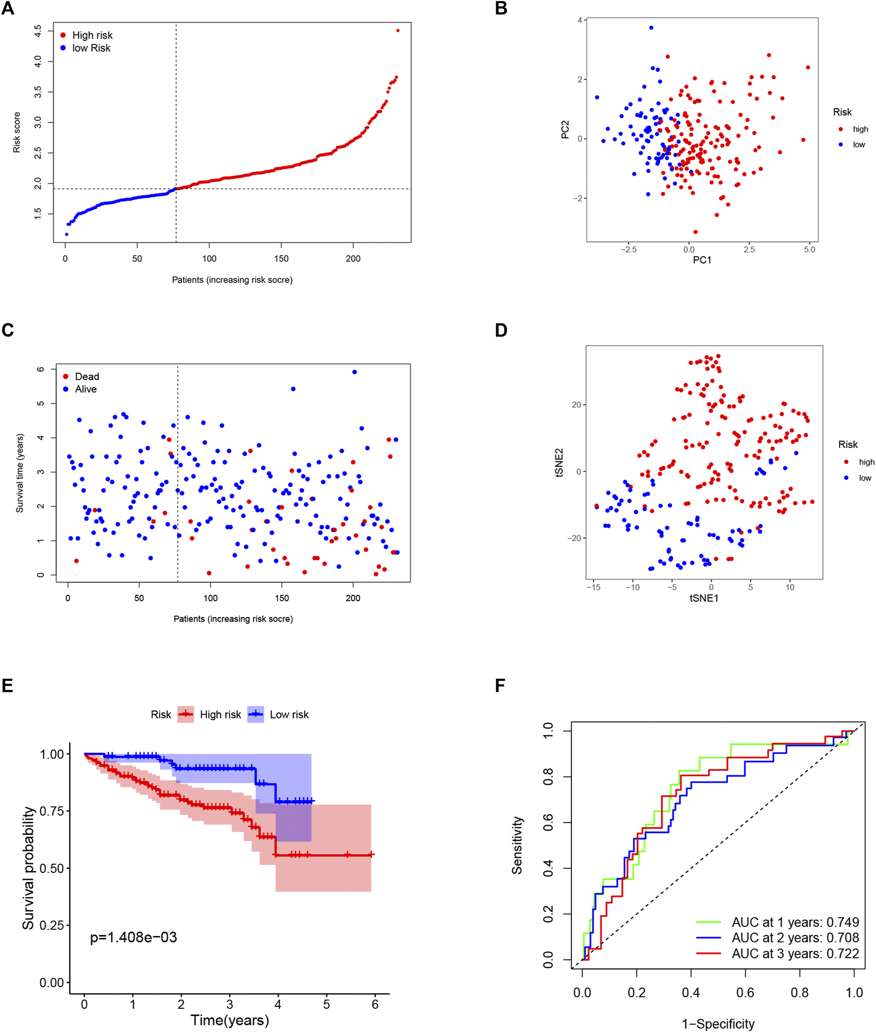 Validation of the 5-gene signature in the ICGC cohort. (A) The distribution and median value of the risk scores in the ICGC cohort. (B) The distributions of overall survival (OS) status. (C) PCA plot of the ICGC cohort. (D) t-SNE analysis of the ICGC cohort. (E) Kaplan–Meier curves for the OS of patients in the high- and low-risk groups. (F). ROC curves in the ICGC cohort.