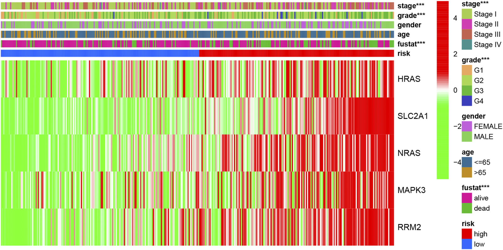 The heatmap of clinicopathological features and ferroptosis-related hub gene expression in two risk subgroups.