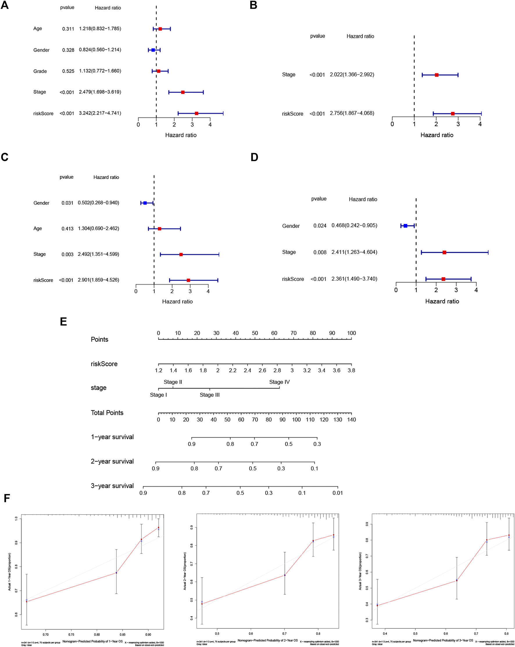 To better apply the signature to clinical practice, we developed a nomogram based on risk score and other independent prognostic factors (TNM stage) in the TCGA cohort (Figure 6E). Moreover, calibration plots of 1-, 2- and 3-year survival probabilities also showed excellent consistency between nomogram predictions and actual observations (Figure 6F).