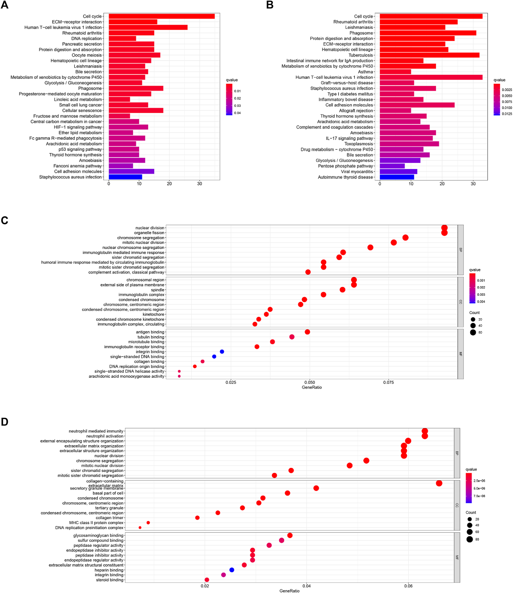 KEGG (A,B) and GO (C,D) enrichment analyses were conducted between the high- and low-risk groups in the TCGA (A,C) and ICGC (B,D) cohorts.