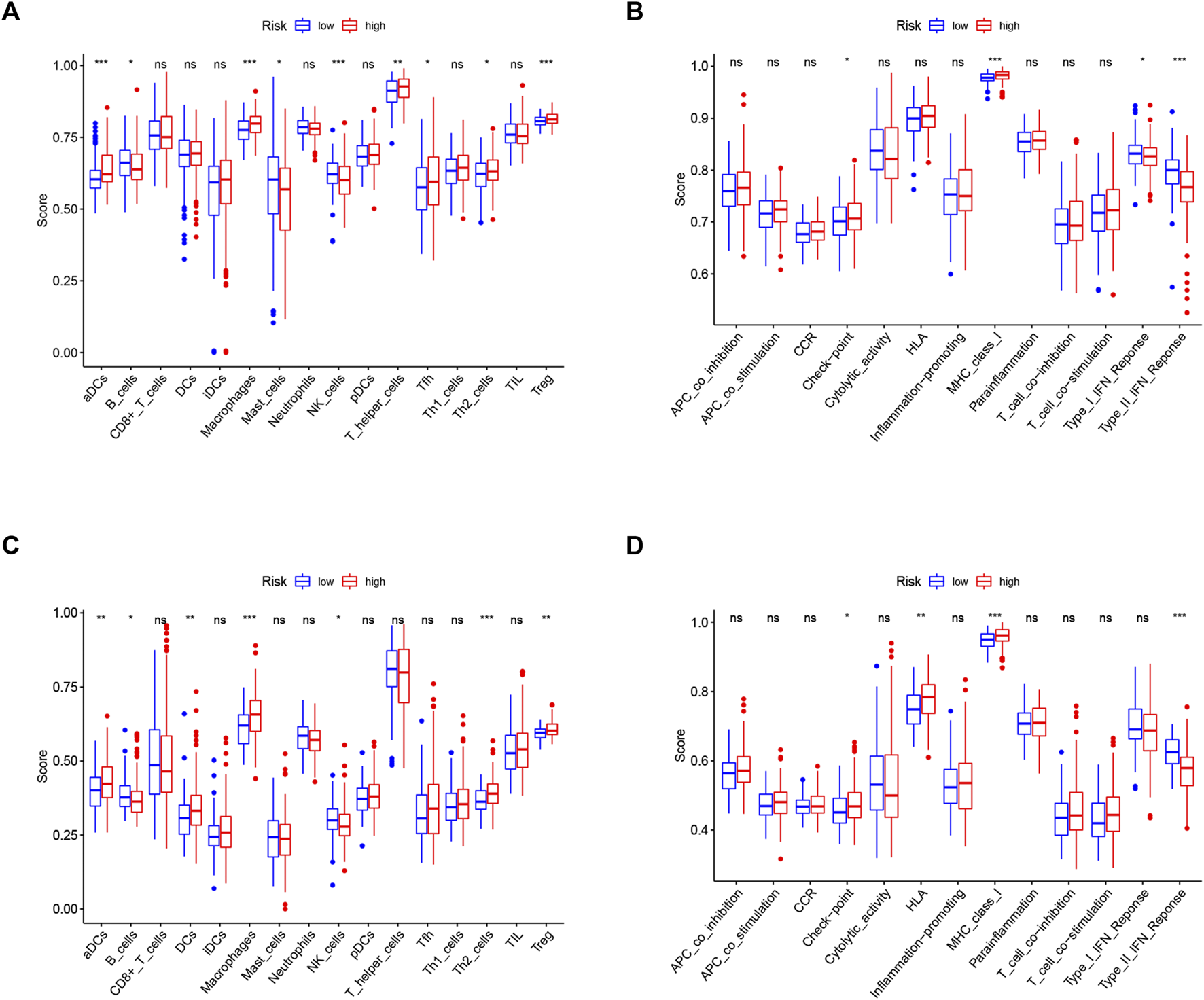 Comparison of the ssGSEA scores between different risk groups in the TCGA cohort (A,B) and ICGC cohort (C,D). The scores of 16 immune cells (A,C) and 13 immune-related functions (B,D) are displayed in boxplots. CCR, cytokine–cytokine receptor. Adjusted p values were shown as ns, not significant; *, p < 0.05; **, p < 0.01; and ***, p < 0.001.
