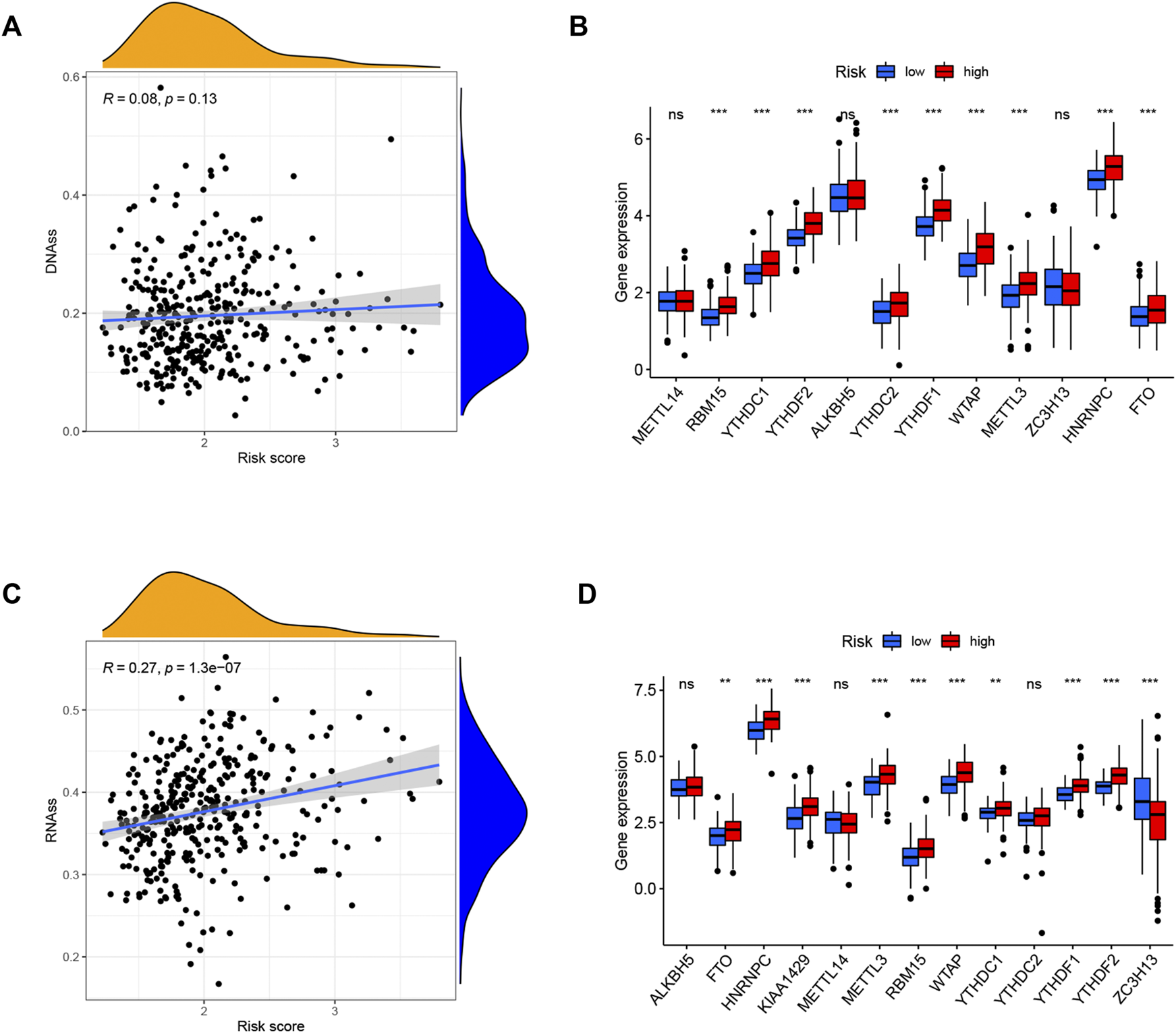 Potential role of risk signature in HCC tumor stemness and m6A-related genes. Associations between risk signature and DNAss (A), RNAss (C). Comparison of the m6A-related genes between different risk groups in the TCGA cohort (B) and ICGC cohort (D).