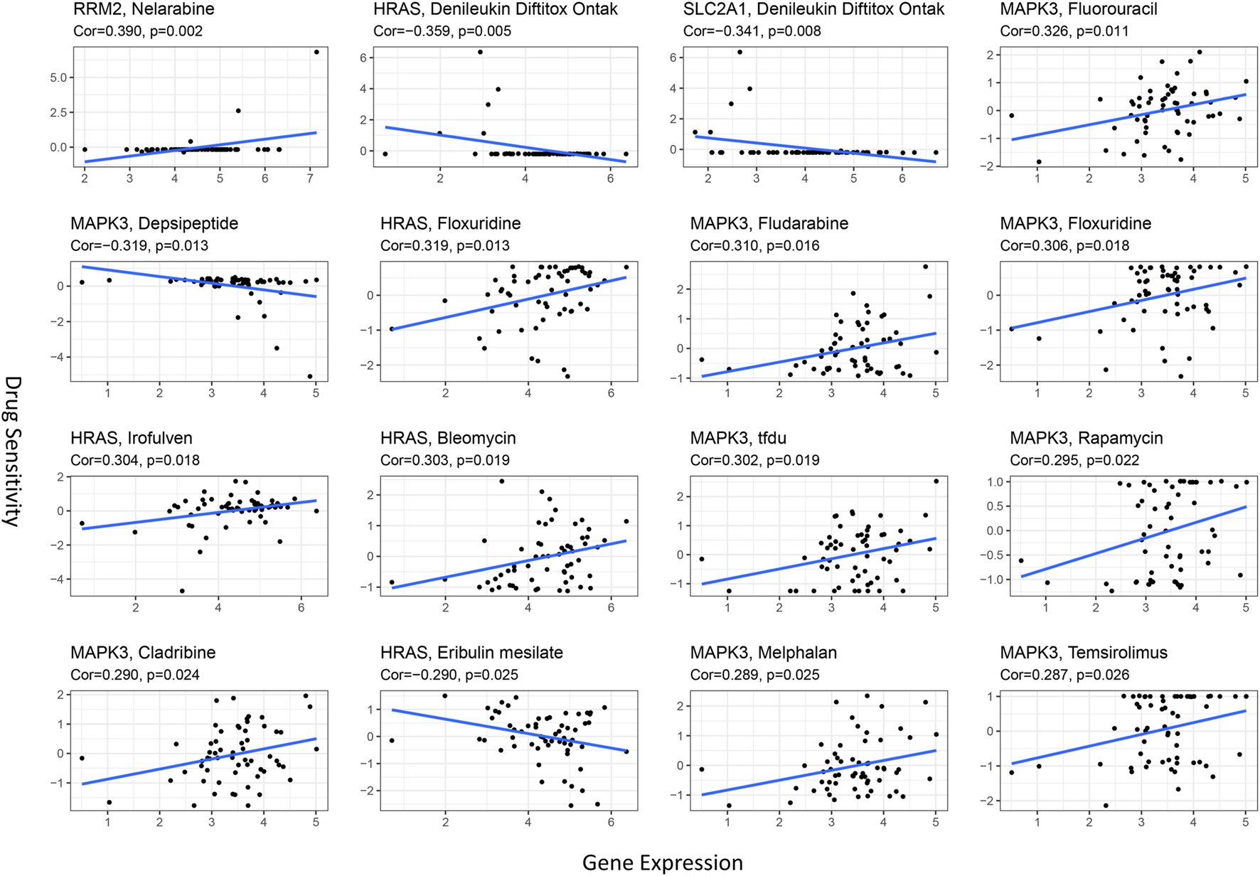 Scatter plots for the association between prognostic hub gene expression in the model and drug sensitivity (top 16 ranked by p-value).
