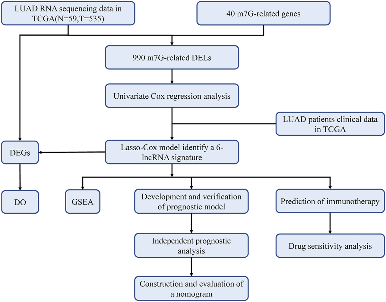 Workflow of this study. The TCGA database was utilized to screen 990 differentially expressed lncRNAs (DELs) in LUAD, which were analyzed with LASSO-COX regression to develop a prognostic model for m7G-related lncRNAs. The prognostic model had been validated in multiple ways and proved to be stable and reliable. Therefore, based on this model, we also performed disease ontology enrichment analysis (DO), gene set enrichment analysis (GSEA), immune-related analysis and drug sensitivity analysis to determine the potential function of prognostic signatures.