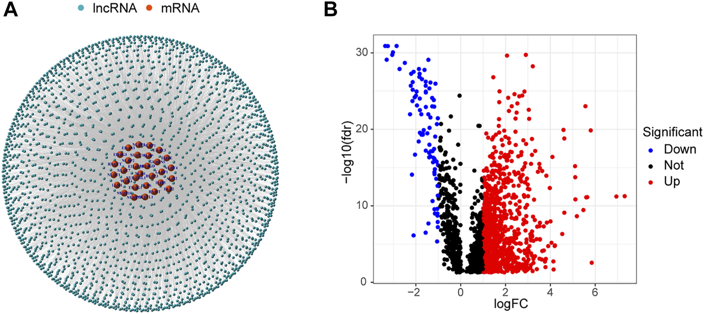 Identification of m7G-related lncRNAs in LUAD patients. (A) Co-expression network of m7G-related lncRNAs and mRNAs. (B) 990 differentially expressed lncRNAs.