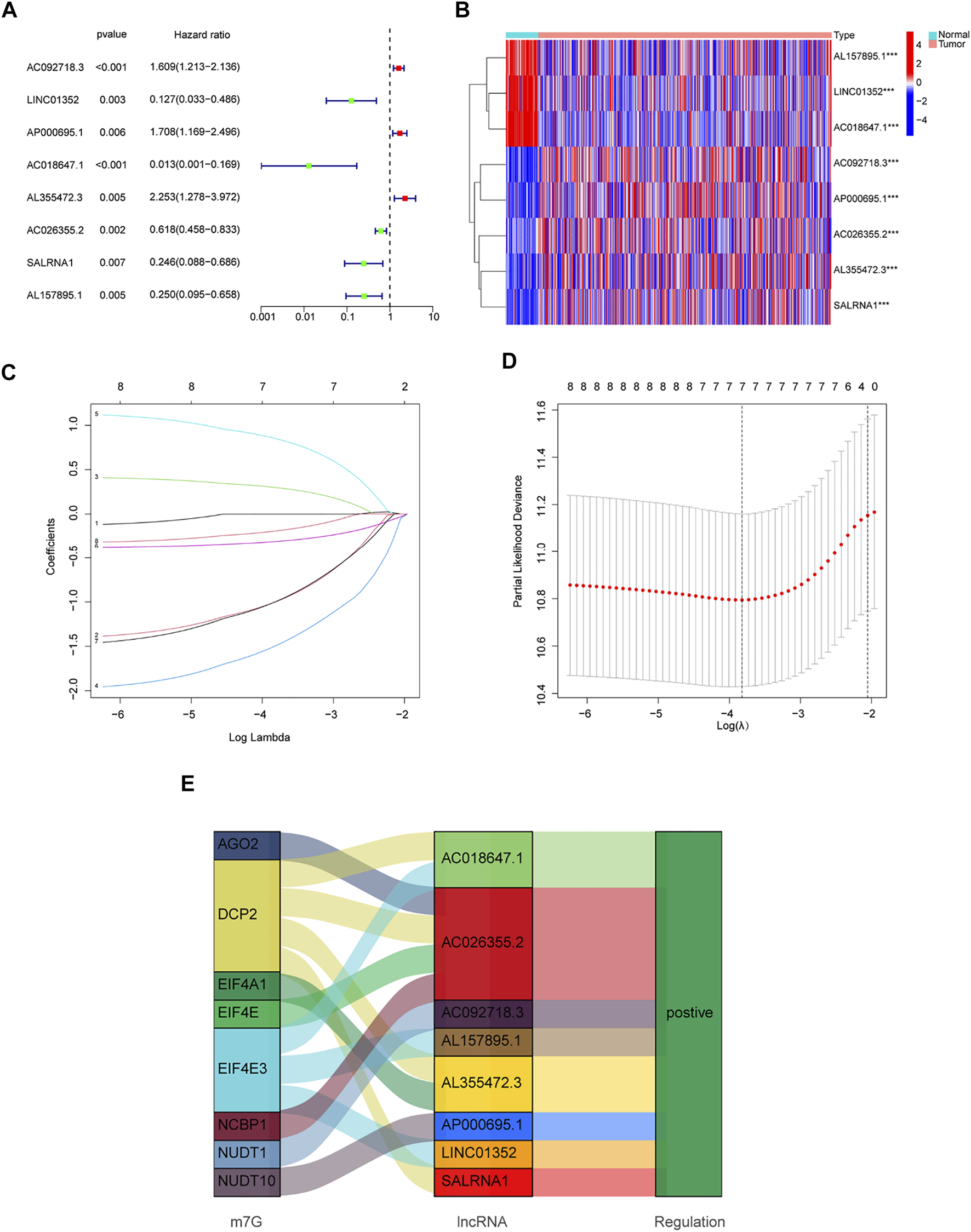 Development of a new prognostic model for m7G-related lncRNAs in LUAD. (A) 8 prognosis-related lncRNAs screened by univariate Cox regression analysis (p < 0.01). (B) Differential expression of prognosis-related lncRNAs in lung normal tissues and adenocarcinoma tissues. (C) LASSO coefficient distribution of 8 m7G-related lncRNAs. (D) The tuning parameter (λ) in the LASSO model is chosen by the minimum criterion. (E) The Sankey diagram depicts the detailed connections between eight prognosis-related lncRNAs and m7G-related genes. *p < 0.05, **p < 0.01, ***p < 0.001.