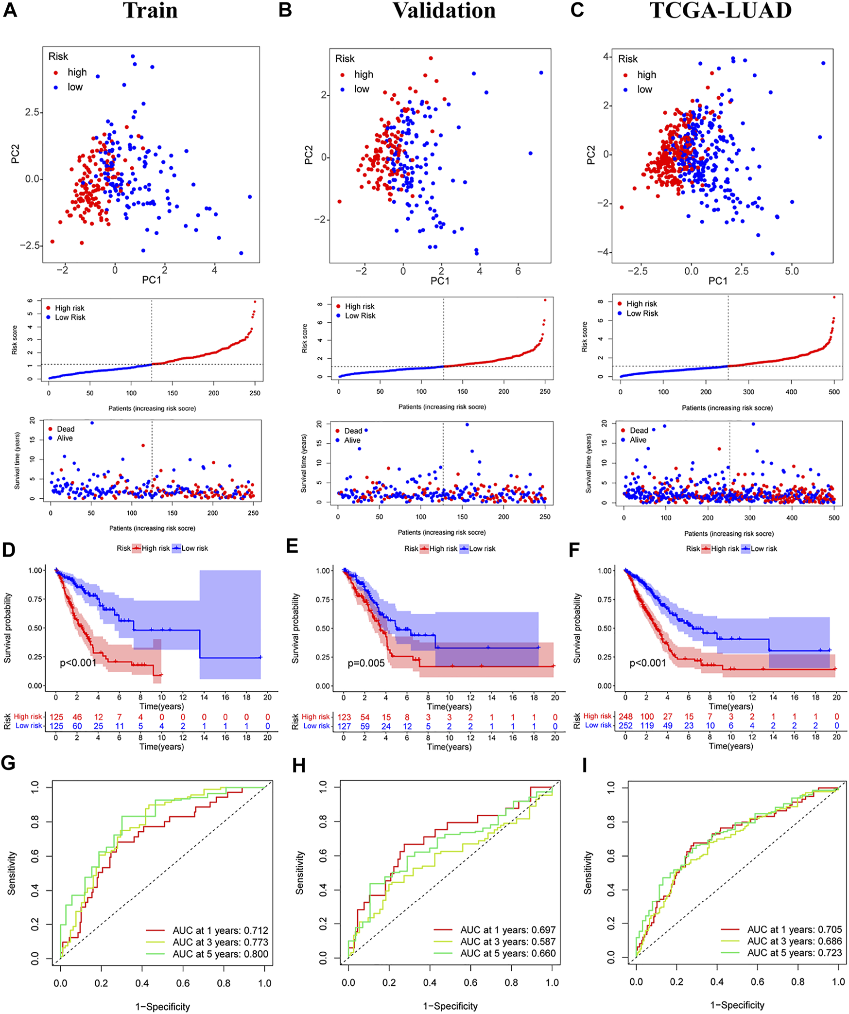 Validation of prognostic models for six m7G-related lncRNAs. (A–C) Principal component analysis, risk score distribution, and survival status distribution for training, validation, and TCGA-LUAD. (D–F) Kaplan-Meier curves of training group, validation group and TCGA-LUAD at different risk groups. (G–I) ROC curves for 1 year, 3 years and 5 years.