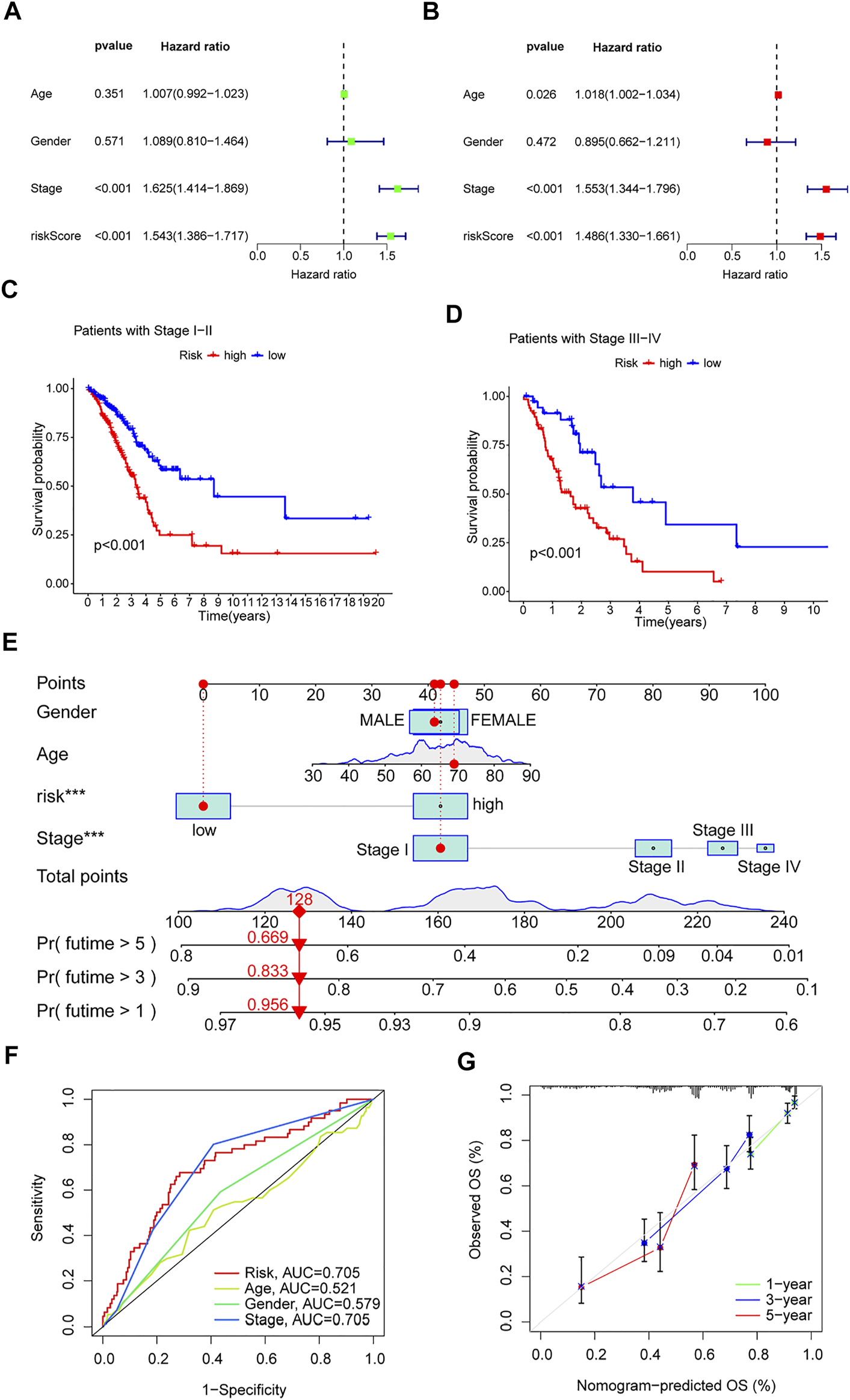 Clinical value of risk characteristics in TCGA-LUAD. (A) Univariate Cox regression analysis of risk scores and clinical factors. (B) Multivariate Cox regression analysis of risk scores and clinical factors. (C,D) Pathological stage was stratified between low- and high-risk groups in the entire collection. (E) Nomogram combining gender, age, stage, and risk score predicts 1-, 3-, and 5-years overall survival. (F) Clinicopathological features and the predictive accuracy of risk models. (G) Calibration curves test the agreement between actual and predicted results at 1, 3, and 5 years. *p < 0.05, **p < 0.01, ***p < 0.001.