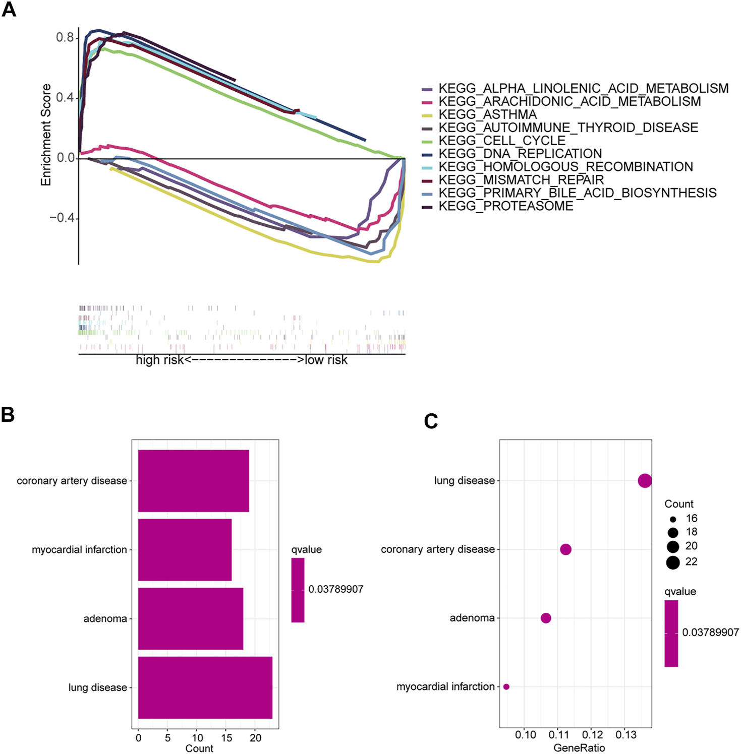 Enrichment analysis of different risk subgroups. (A) Five pathways were significantly enriched in each of the high-risk and low-risk groups. (B,C) DO enrichment analysis of DEGs based on different risk subgroups.