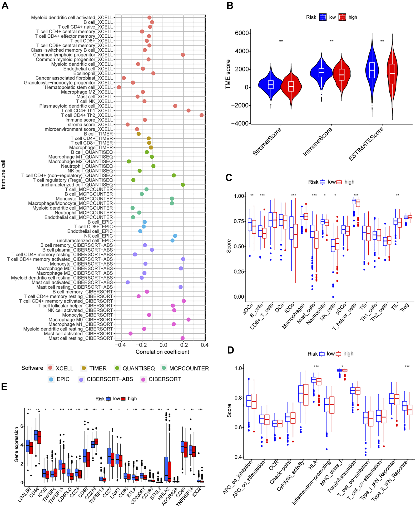 Immune signatures of different risk groups. (A) Correlation between risk scores and immune cells. (B) Comparison of immune-related scores between low-risk and high-risk groups. (C,D) Enrichment scores for 16 immune cells and 13 immune-related pathways. (E) Differences in the expression of 22 checkpoints in different risk groups. *p < 0.05, **p < 0.01, ***p < 0.001.
