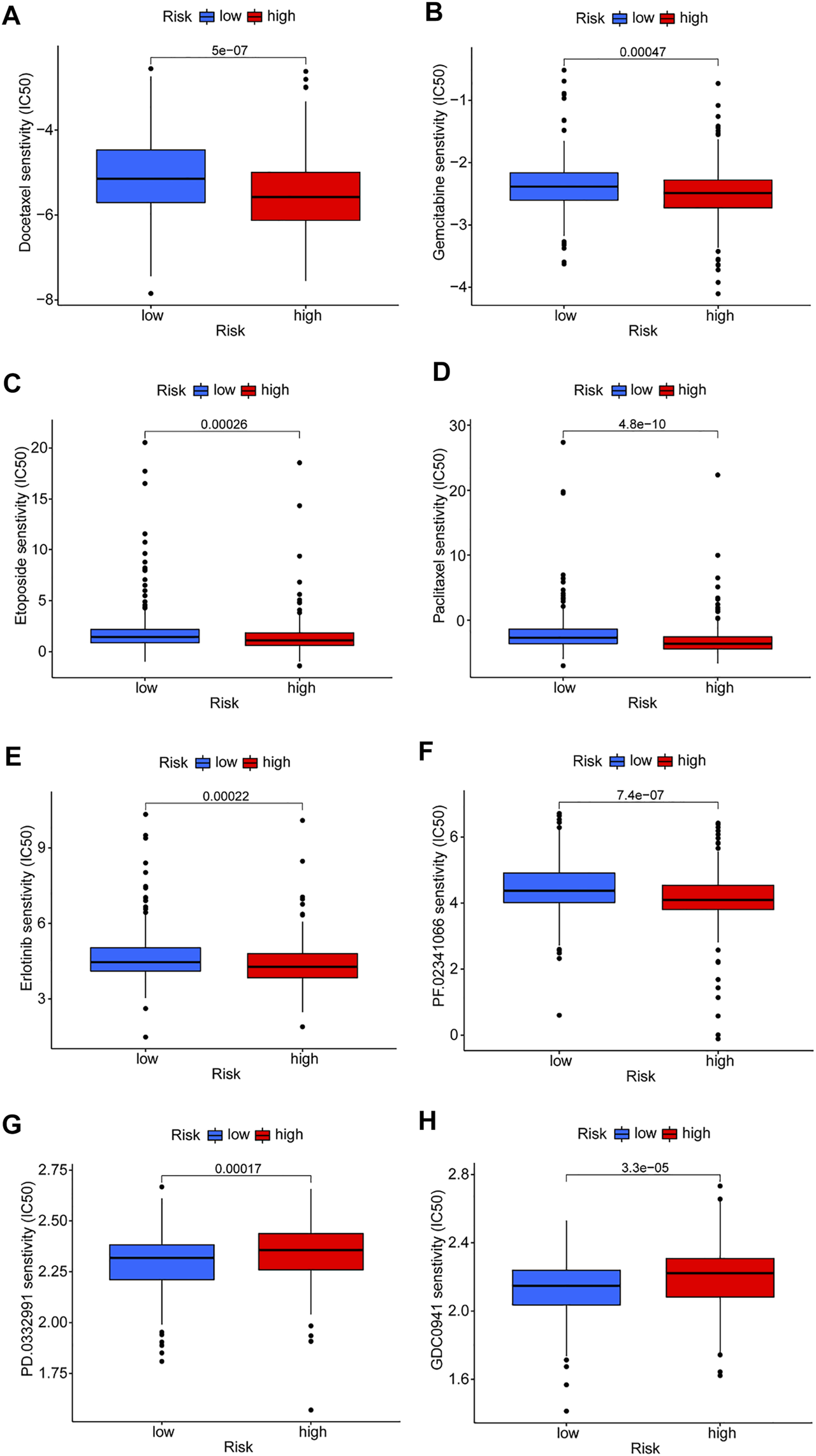 Prediction of drug susceptibility in different risk groups. (A–F) Sensitive drugs in high-risk groups. (G,H) Sensitive drugs in low-risk groups.
