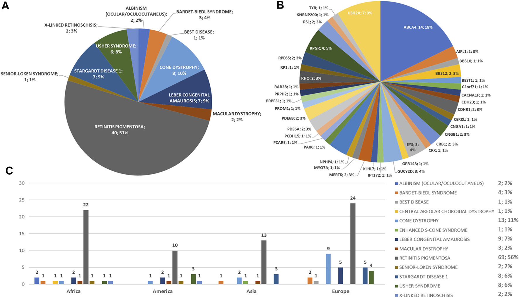 Results: The article reports the results of the phenotypes and genotypes of 123 IRD probands, 69 males and 54 females, mean age 41 (IQR, 54–30) years, disease onset at 13 (IQR, 27.25–5) years. Thirty-three patients out of 123 (26.8%) were Africans (North/Northwest Africa), 21 (17.1%) Asians, 19 (15.4%) Americans (South/Central America) and 50 (40.7%) Europeans (Eastern Europe). Retinitis pigmentosa was the most represented phenotype (56%), followed by cone dystrophy (11%) and Leber congenital amaurosis (7%), while ABCA4 was the most frequently mutated gene (18%), followed by USH2A (9%) and RPGR (5%). About ABCA4 variants found in Stargardt disease, macular and cone dystrophies were predominant in Asian (42%) and European (21%) patients. The most represented inheritance pattern was autosomal recessive, while a higher frequency of homozygous patients versus compound heterozygotes as compared to previous studies on Italian IRD patients was evidenced, reflecting a possible higher frequency of inbreeding marriages.