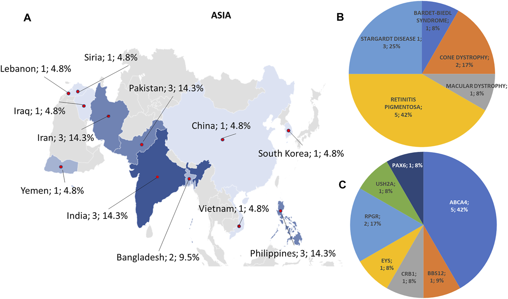 Phenotype and genotype distributions in Asian countries. (A) The map shows the numbers and percentages of examined patients. Pie charts show (B) the phenotypes and (C) genotypes of positive cases.