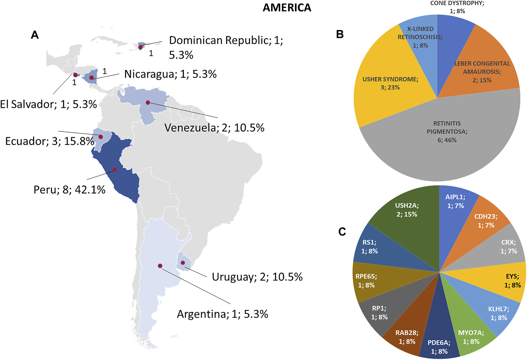 Phenotype and genotype distributions in American countries. (A) The map shows the numbers and percentages of examined patients. Pie charts show (B) the phenotypes and (C) genotypes of positive cases.