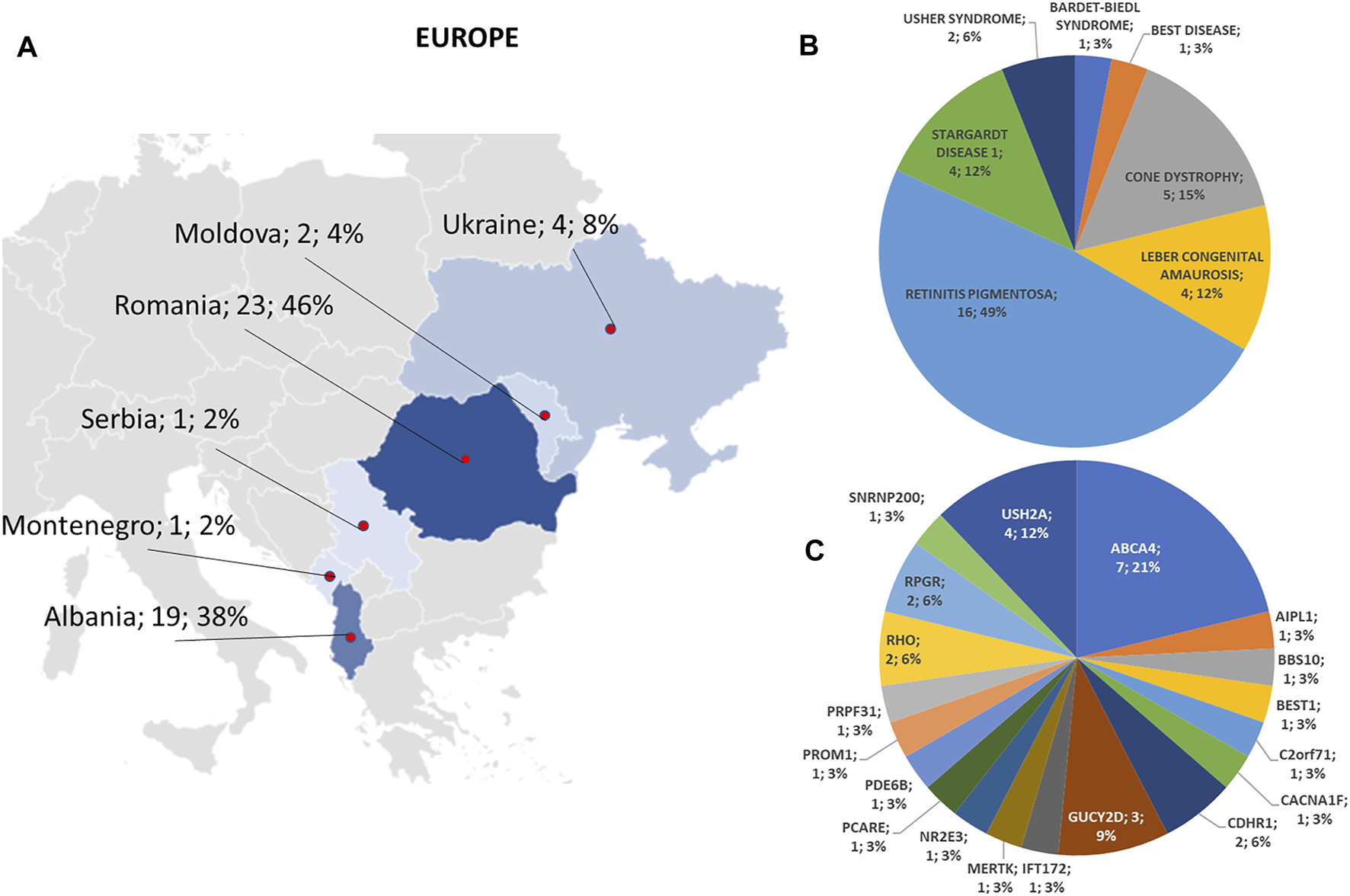 Phenotype and genotype distributions in European countries. (A) The map shows the numbers and percentages of examined patients. Pie charts show (B) the phenotypes and (C) genotypes of positive cases.