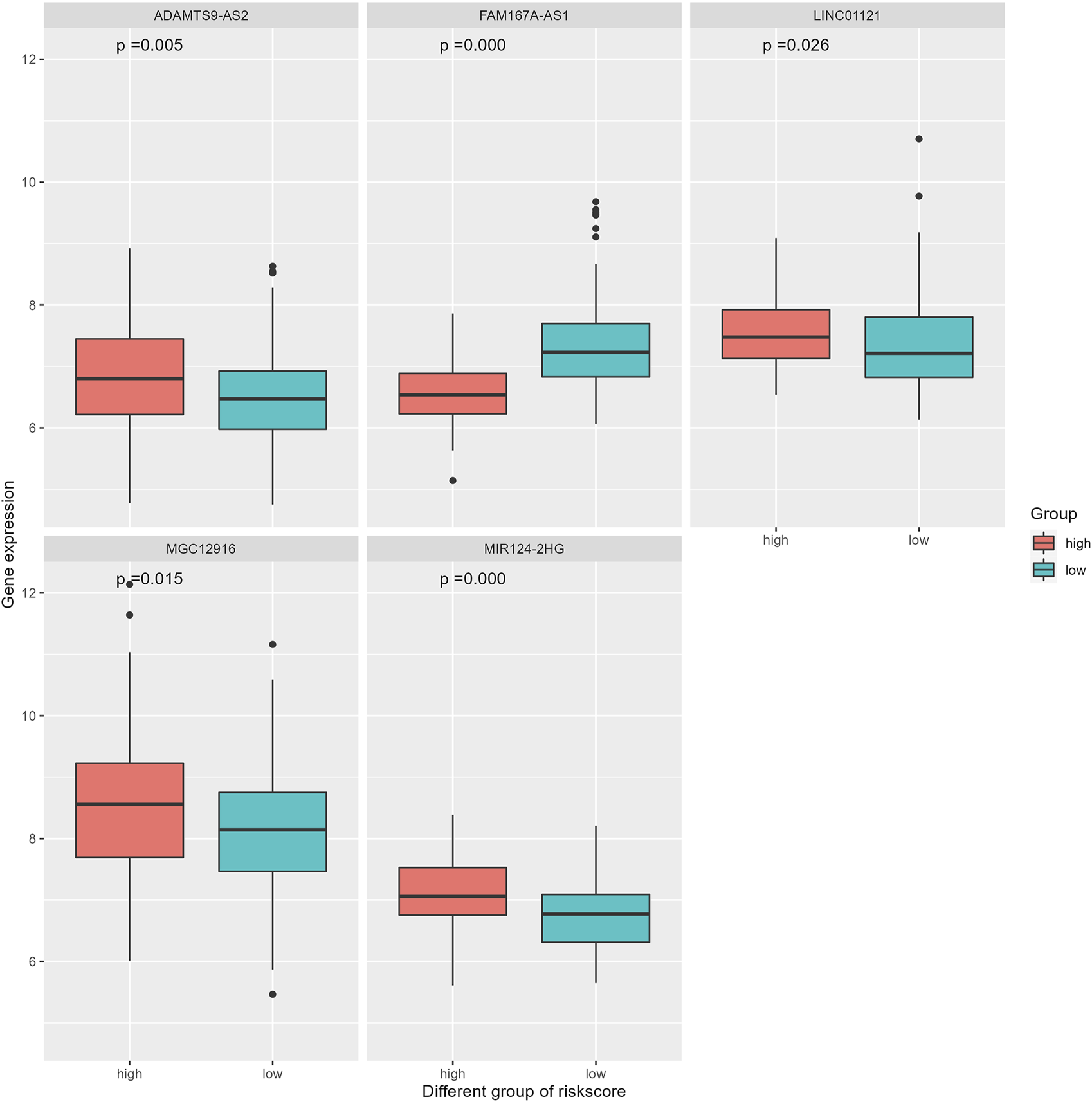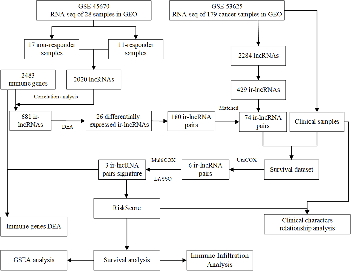 The immune gene list was download from the ImmuPORT database (https://www.immport.org/). Subsequently, the subsets of immune genes or lncRNAs were extracted from the GSE45670 dataset and GSE53625, respectively. The correlation test was performed on the immune gene expression matrix and the lncRNA expression matrix, and the related lncRNAs were screened as ir-lncRNAs. The screening criteria were: correlation coefficient ρ ≥ 0.4 or ρ ≤ −0.4 and p ≤ 0.0001. Differential expression analysis (DEA) was performed on eligible ir-lncRNAs via the “limma” and “SVA” packages, and the expression difference was defined as: the absolute value of the log2 value (fold change) of the difference fold was greater than (mean ± 2 times the standard deviation of expression); p value ≤ 0.05. The differentially expressed lncRNAs were paired for each other. Taking the LINC01121|FAM167A-AS1 gene as an example, if the expression of LINC01121 gene was greater than that of FAM167A-AS1 gene, the matched index was recorded as 1, otherwise as 0. The ir-lncRNA pairs were introduced as independent variables into the COX prediction model to establish a prognostic risk-model.