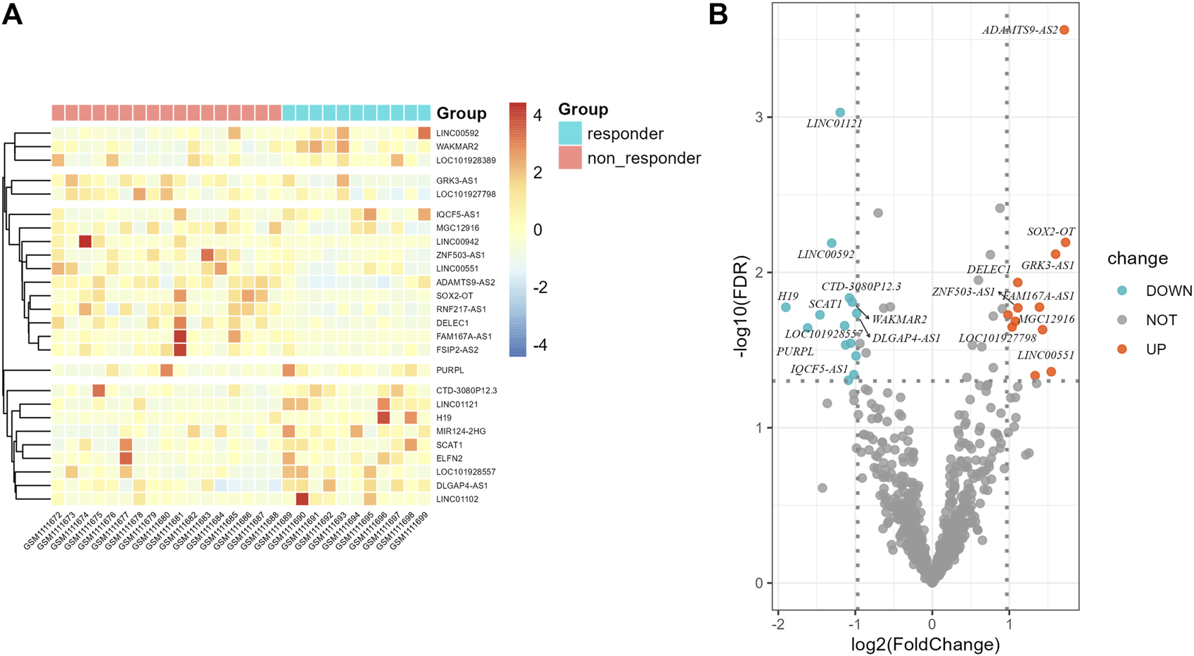 Differential expression results of immune-related lncRNAs in GSE45670 cohort. (A) Heatmap, (B) Volcano map.
