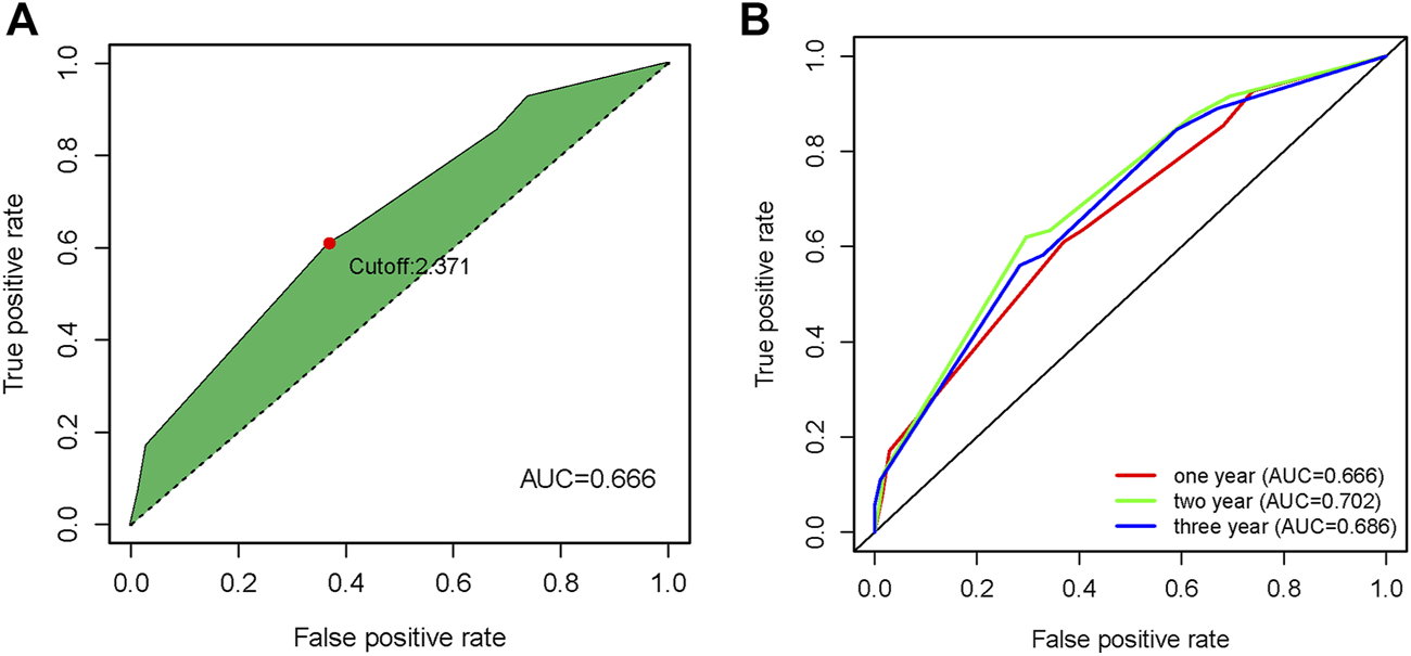 The results of univariate COX analysis showed that there were six ir-lncRNA pairs of statistical significance associated with survival outcomes (p < 0.05). In order to verify the positive variables obtained by univariate COX regression, LASSO regression (Least absolute shrinkage and selection operator) was further used to screen significant ir-lncRNAs as independent variables for multivariate COX analysis. As a result, five ir-lncRNA pairs, that is, LINC01121|FAM167A-AS1, ADAMTS9-AS2|MGC12916, MIR124-2HG|FAM167A-AS1, LINC00942|ADAMTS9-AS2, and PURPL|FAM167A-AS1, were the most powerful explanatory set of ir-lncRNAs as potential independent variables in multivariate COX model. A further multivariate COX regression was performed, and the results showed that three ir-lncRNA pairs were statistically significant (p < 0.05), namely LINC01121|FAM167A-AS1, ADAMTS9-AS2|MGC12916, and MIR124-2HG|FAM167A-AS1. The above analysis revealed that the three ir-lncRNA pairs could serve as independent prognostic factors for ESCC. Since the hazard ratios of the three ir-lncRNAs were all greater then 1, they were considered to be risk factors for the prognosis of ESCC (as shown in Table 3 and Figure 3). Lasso regression road map and selection map were shown in Supplementary Figures S1, S2. ROC curves were used to assess the predictive ability and accuracy of the predictive models based on the three ir-lncRNA pairs. The results showed that the best cut-off point was 2.371 and the area under the curve (AUC) at 1-, 2-, and 3-year were 0.666, 0.702, and 0.686, respectively, as shown in Figures 4A,B.