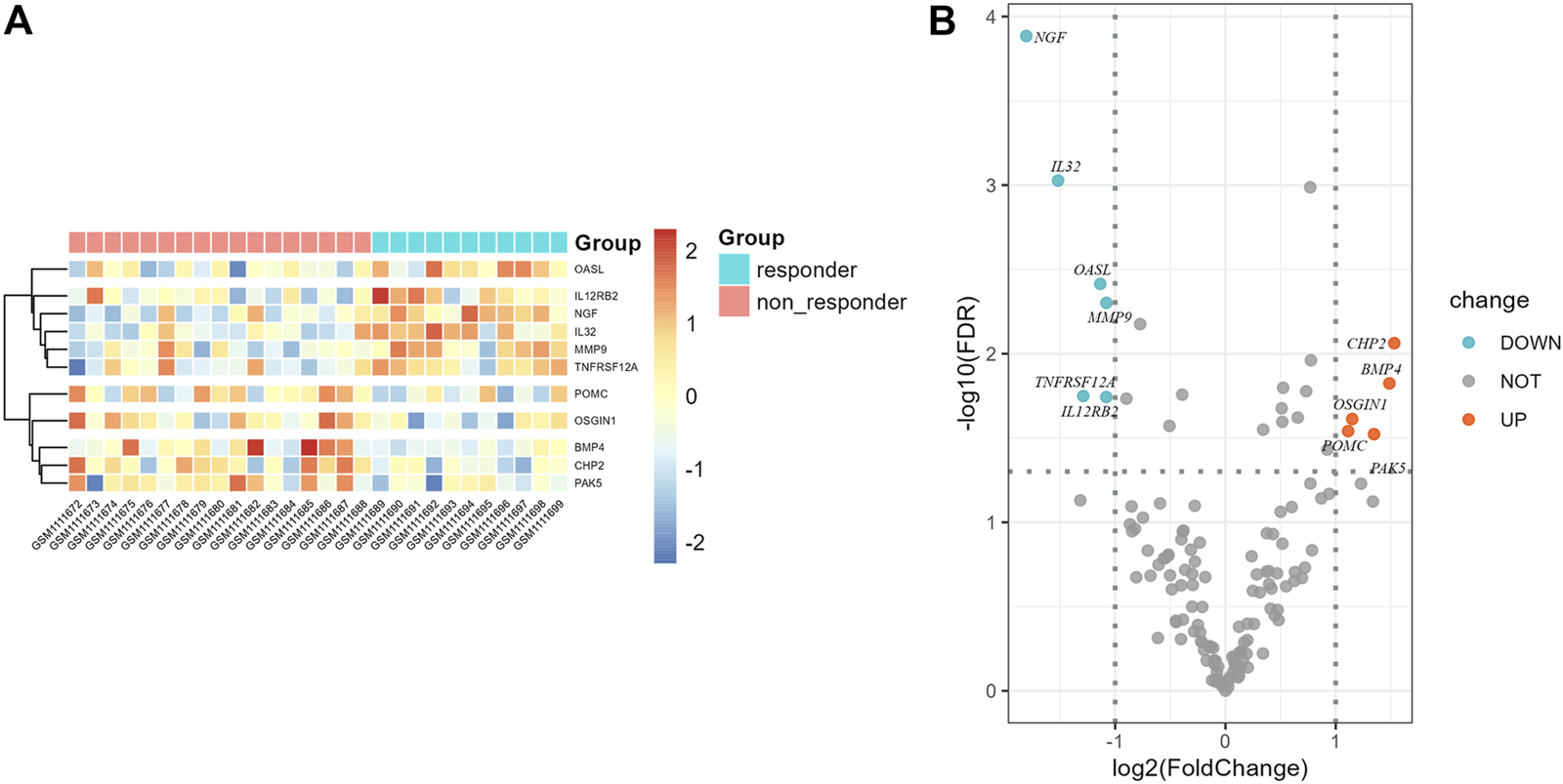 Based on those ir-lncRNAs screened from the GSE53625 dataset with prediction model, the immune-related genes in the GSE45670 dataset were reversely extracted, and the differential expression analysis of immune-related genes were compared between the non-responder group and the responder group. A heat map and a volcano plot were drawn.