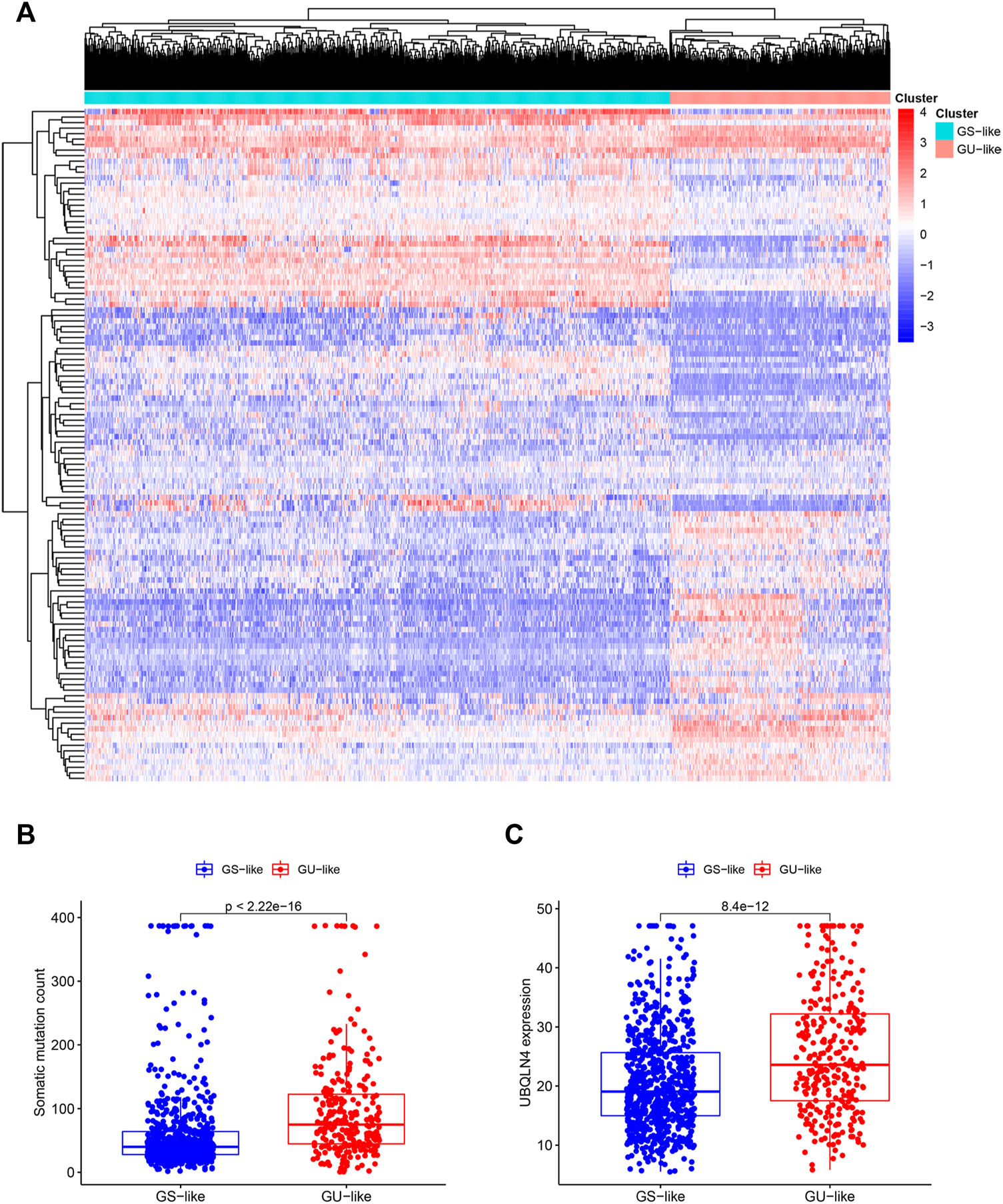 Hierarchical clustering of breast cancer patients and the characteristics between the groups. (A). Hierarchical clustering of 1,066 breast cancer patients based on the expression pattern of 122 candidate genetic instability-derived lncRNAs. The left blue cluster was the GS-like group (n = 774), and the right red cluster was the GU-like group (n = 292). (B). Boxplot of somatic mutations count between two groups. (C). UBQLN4 expression level between these two groups.