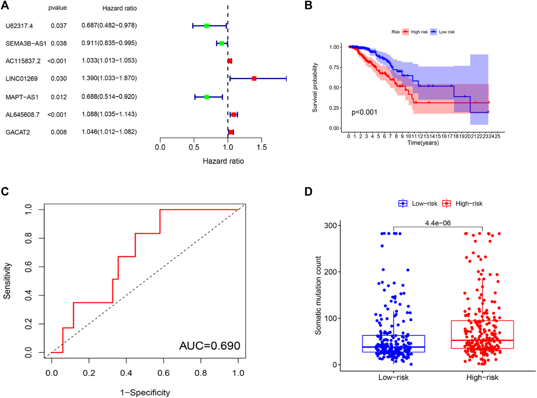 Establishment of genetic instability-related lncRNA signature (GILncRNASig) for prognosis prediction and identification of the predictive efficacy of the model. (A). Forest plot of 7 lncRNAs, which were screened from candidate genetic instability-derived lncRNAs through univariate Cox analysis and Lasso analysis. (B). Kaplan–Meier curves of overall survival of patients with low or high risk predicted by the GILncRNASig in the training set. (C). Time-dependent ROC curve analysis of the GILncRNASig. (D). Boxplot of somatic mutations count between the High-Risk and Low-Risk groups in the training set.