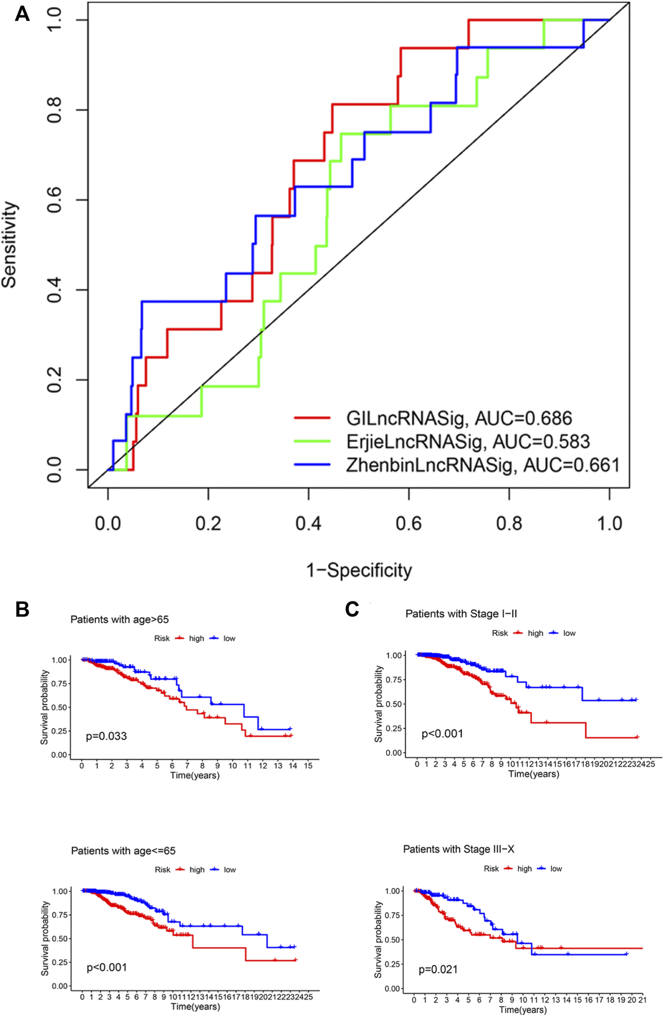 Identification of the efficiency of GILncRNASig in clinical characteristics. (A). Comparison of the time-dependent ROC curve with other characteristic-related lncRNAs model. (B). Kaplan–Meier curves of overall survival of patients between low- and high-risk groups in patients with Age <65 and Age ≥65. (C). Kaplan–Meier curves of overall survival of patients between low- and high-risk groups in patients with Stage I–II and Stage III–IV.
