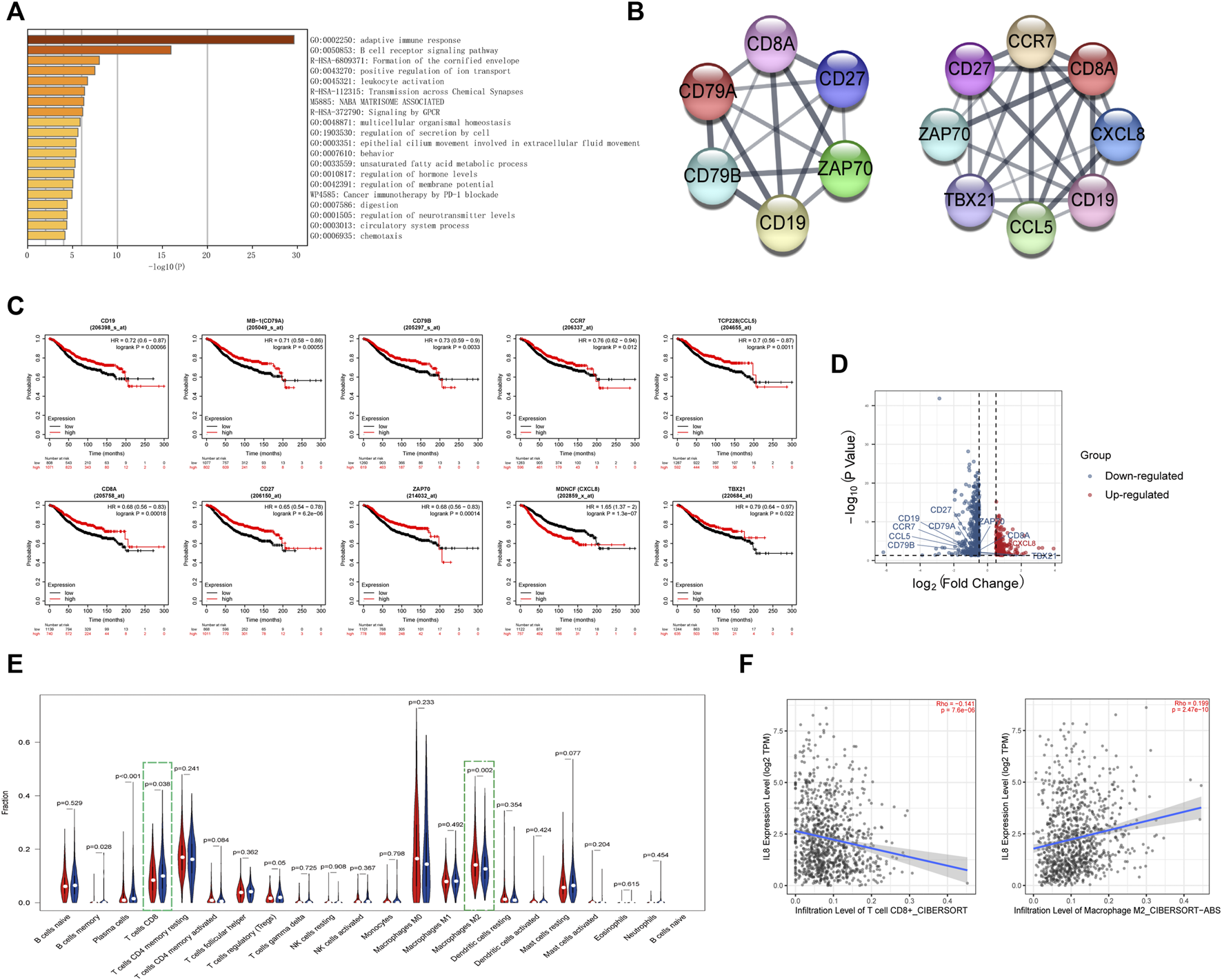 Identification of the immune-related pathways involved in the differentially expressed genes between high- and low-risk groups.(A). The enrichment pathways for the differentially expressed genes between the high- and low-risk groups. (B). The hub genes related to the adaptive immune pathway and the B-cell receptor signaling pathway. (C). Kaplan–Meier curves of overall survival of the hub genes for breast cancer patients in Kaplan-Meier Plotter database. (D). Volcano plot of hub genes between the high- and low-risk groups. The right red labeled gene was significantly higher in the high-risk group than the low-risk group, and the left blue labeled genes were significantly lower in the high-risk group than the low-risk group. (E). Boxplot of the infiltration level of immune-associated cells in the high- and low-risk groups. (F). The expression of CXCL8 was negatively correlated with CD8+ T cell infiltration and positively correlated with M2 macrophage infiltration in TIMER 2.0 database.